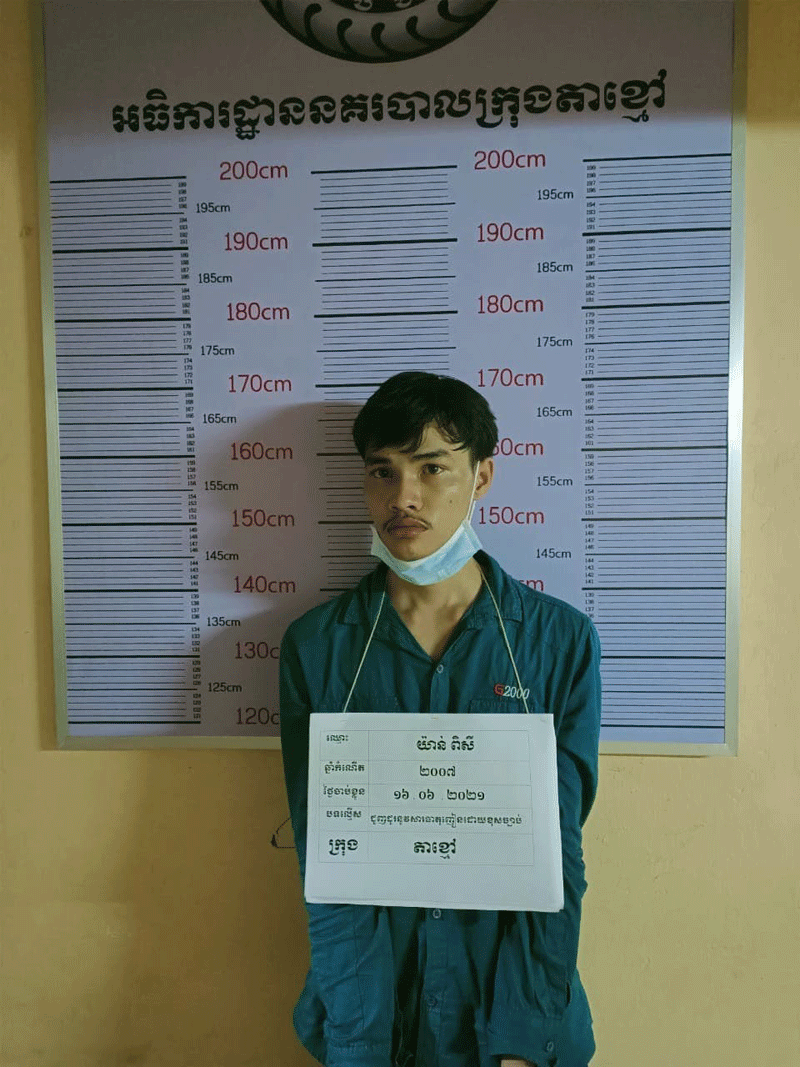 ប៉ូលិសនិយាយថា ជនសង្ស័យ២នាក់គេចខ្លួនម្នាក់រួមមាន ១-ឈ្មោះយ៉ាន់ ពិសី ភេទប្រុសអាយុ២១ឆ្នាំ រស់នៅភូមិស្ទឹងជ្រៅ សង្កាត់ដើមមៀន ក្រុងតាខ្មៅ ខេត្តកណ្តាលមុខរបរបុគ្គលិកណែត(ឃាត់ខ្លួន)និង២- ឈ្មោះ ហៅ ភេទប្រុស រស់នៅក្នុងភូមិស្ទឹងជ្រៅ សង្កាត់ដើមមៀន ក្រុងតាខ្មៅ ខេត្តកណ្តាល មុខរបរមិនពិតប្រាកដ(គេចខ្លួន)។