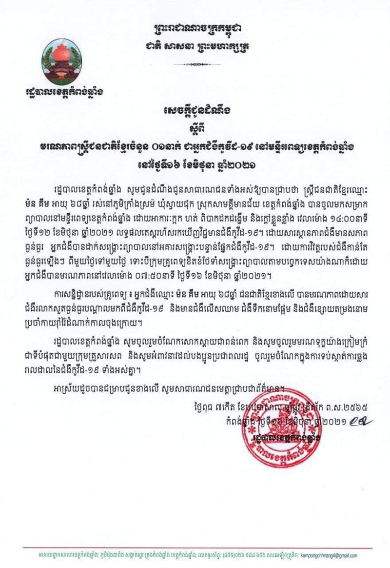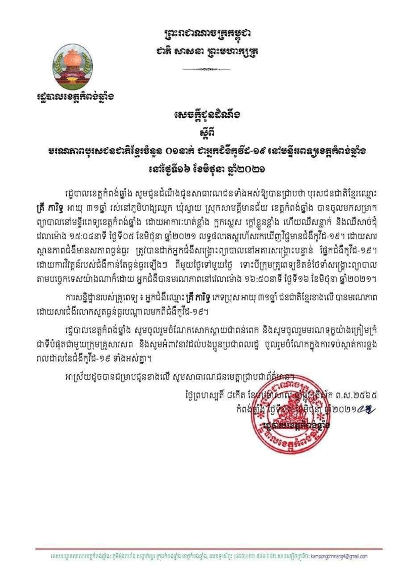 ខេត្តកំពង់ឆ្នាំង:សេចក្តីជូនដំណឹងរបស់រដ្ឋបាលខេត្តកំពង់ឆ្នាំងស្តីពីមរណភាពបុរស១នាក់ទៀតហើយជាអ្នកជម្ងឺកូវិដ១៩សម្រាកព្យាបាលនៅមន្ទីពេទ្យខេត្តកំំពង់ឆ្នាំងនៅថ្ងៃទី១៦មិថុនា២០២១ ។
