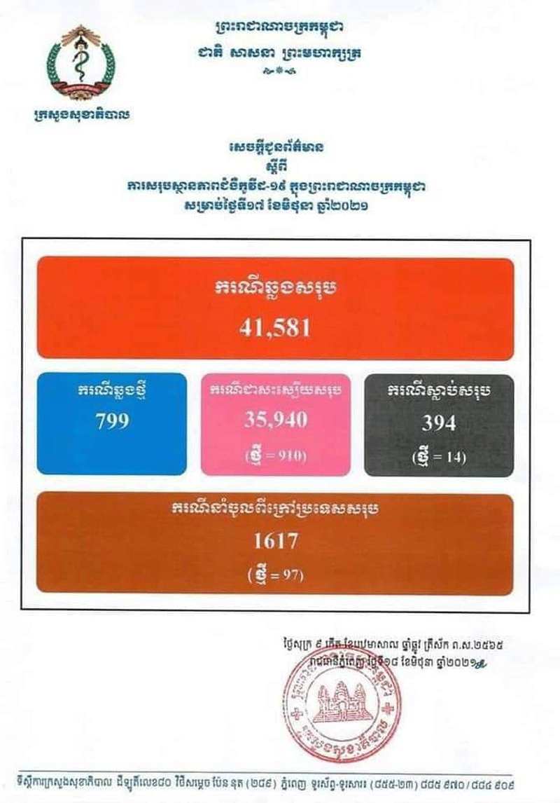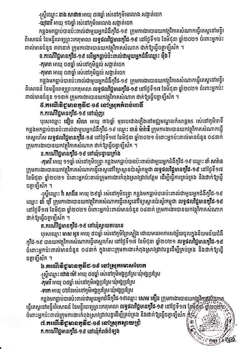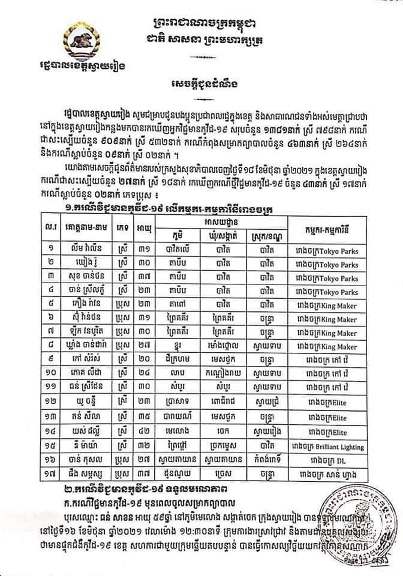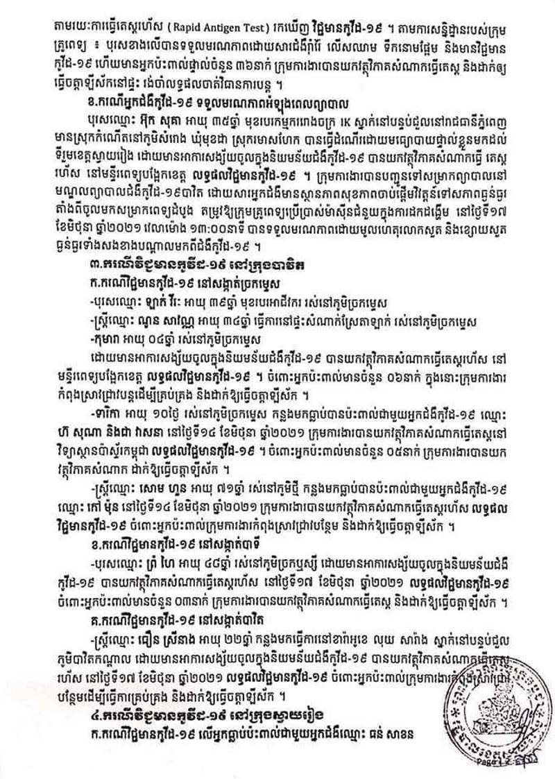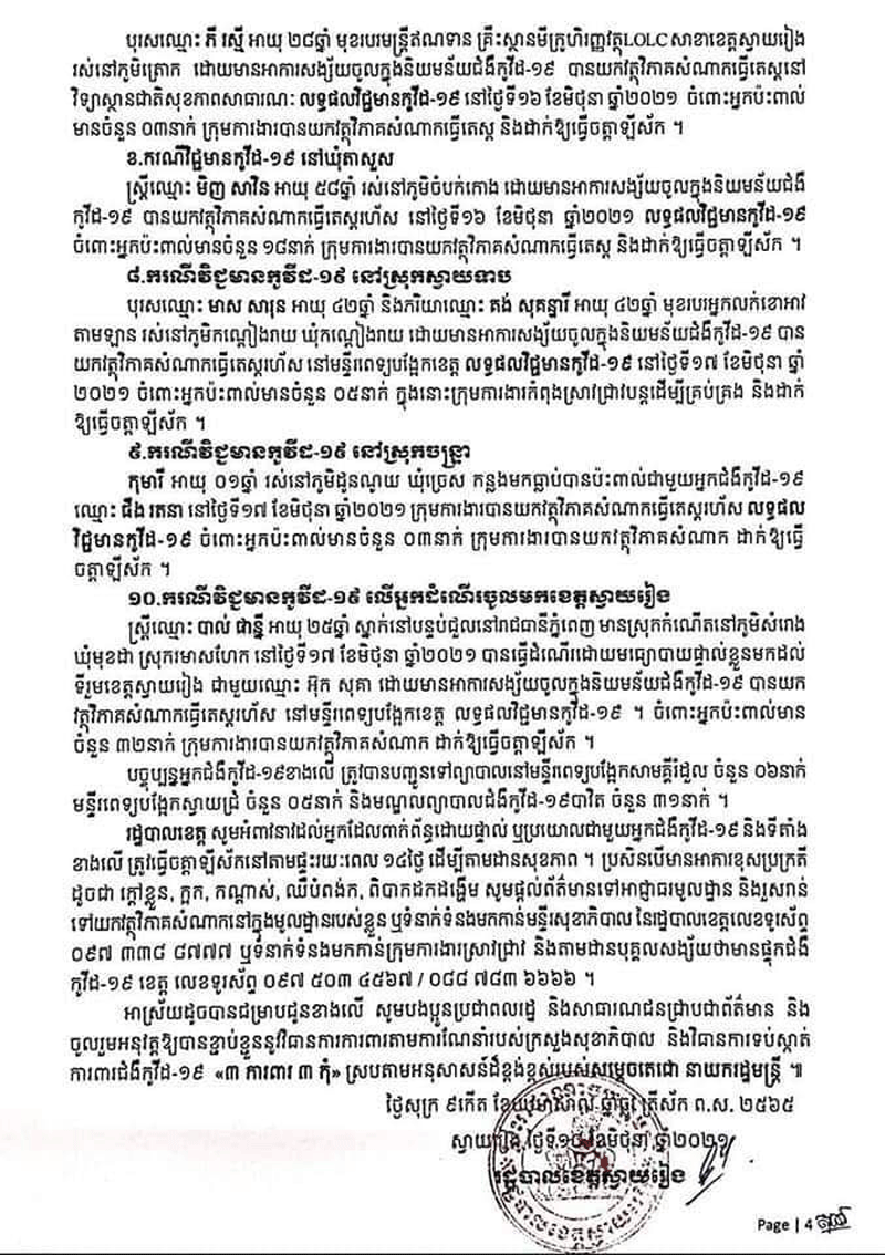 ករណីទី២.ទទួលមរណភាពក្នុងអំឡុងពេលព្យាលជំងឺកូវីដ-១៩នោះមានឈ្មោះ អ៊ុក សុគា ៣៥ឆ្នាំមុខរបរកម្មកររោងចក្រ1kស្នាក់នៅបន្ទប់ជួលនៅរាជធានីភ្នំពេញមានស្រុកនៅភូមិ សំរោង ឃុំ មុខដា ស្រុក រមាសហែក ខេត្តស្វាយរៀងបានធ្វើដំណើរដោយ មធ្យោបាយផ្ទាល់ ខ្លួនមកដល់ទឹកដីទីរួមខេត្តស្វាយរៀងដោយមានអការសង្ស័យចូលក្នុងនិមយន័យជំងឺកូវីដ-១៩សភាពចាប់ផ្តើនិវត្តន៍ទៅសភាពធ្ងនធ្ងរតតម្រូវឲ្យក្រុមគ្រូពេទ្យប្រើប្រាស់នូវម៉ាសុីនជំនួយក្នុងការដកដង្ហើមហើយនៅថ្ងៃទី១៧ខែមិថុនាឆ្នាំ២០២១វេលាម៉ោង១៣ៈ០០នាទីបានទទួលមរណភាពដោយសាររលាកសួតនិងខ្សោយសួតធ្ងន់ធ្ងរទាំងសងខាងបង្កឡើងដោយជំងឺកូវីដ-១៩។ក្នុងនោះដែរ រដ្ឋបាលខេត្តស្វាយរៀង៖សូមអំពាវនាវដល់អ្នកដែលបានប្រាស្រ័យទាក់ទង ប៉ះពាល់ដោយផ្ទាល់ឬប្រយោល ជាមួយបុគ្គលវិជ្ជមានកូវីដ១៩ ទាំង៤៣នាក់ខាងលើសូម ដាក់ខ្លួនដាច់ដោយឡែកតាមដានសុខភាព រយៈពេល១៤ថ្ងៃ ហើយប្រសិនមានអាការខុសប្រក្រតី ដូចជា ក្តៅខ្លួន ក្អក កណ្តាស់ ឈឺបំពង់ក ពិបាកដកដង្ហើម សូមផ្តល់ព័ត៌មានទៅអាជ្ញាធរមូលដ្ឋាននិងរួសរាន់ទៅយកវត្ថុវិភាគសំណាកឬទាក់ទងមកកាន់លេខទូរស័ព្ទ ០៩៧ ៥០៣ ៤៥៦៧/០៤៤៧១២៥២២និងសូមឲ្យបងប្អូនប្រជាពលរដ្ឋចូលរួមអនុវត្តឲ្យខ្ចាប់ខ្ជួននូវវិធាការការពារតាមណែនាំរបស់ក្រសួងសុខាភិបាលនិងវិធានការទប់ស្តាត់ការពារជំងឺកូវីដ-១៩«៣ ការពារ ៣ កុំ»ស្របតាមអនុសាសន៍ដ៏ខ្ពង់ខ្ពស់របស់សម្តេចតេជោ ហ៊ុន សែន នាយករដ្ឋមន្ត្រី៕