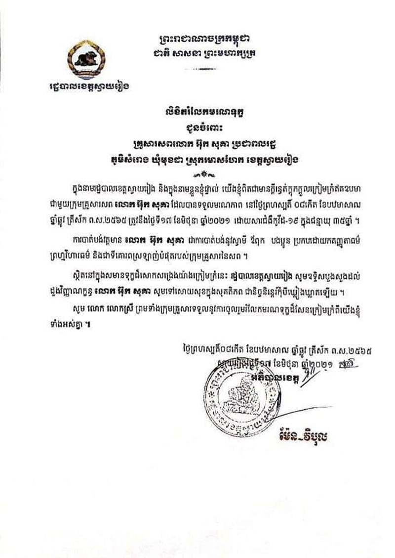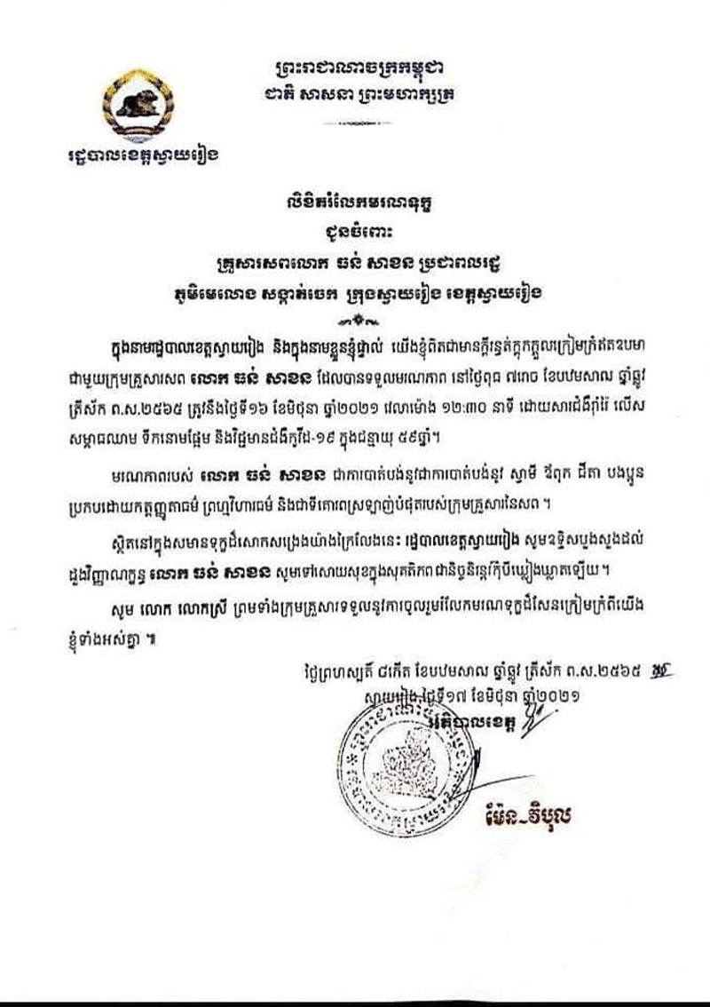 ខេត្តស្វាយរៀង៖រដ្ឋបាលខេត្តស្វាយរៀងពិតជាមានក្តីរន្ធត់ និងសោកស្តាយដោយបានទទួល ព័ត៌មានអំពីការស្លាប់របស់អ្នកមានវិជ្ជមានកូវីដ-១៩ ចំនួន ០២នាក់ កាលពីថ្ងៃទី១៧ ខែមិថុនា ឆ្នាំ២០២១ បានបង្ហាញយ៉ាងច្បាស់លាស់ពីហានិភ័យដ៏កាច សាហាវដល់អាយុជីវិតបងប្អូន ប្រជាពលរដ្ឋខេត្តស្វាយរៀងក៏ដូចមនុស្សទូទៅក្នុងព្រះរាជាណាចក្រកម្ពុជាផងដែរ ។ យើងខ្ញុំសូមចូលរួមរំលែកទុក្ខជាមួយក្រុមគ្រួសារ ចំពោះការបាត់បង់សាច់ញាតិជា ទីគោរពស្រឡាញ់ និងសូមបួងសួងដួងវិញ្ញាណក្ខន្ធដែលបានស្លាប់ បាត់បង់ដោយសារ ជំងឺកូវីដ-១៩ឆាប់បានចាប់បដិសន្ធិក្នុងសុគតិភពកុំបីឃ្លៀងឃ្លាតឡើយ។ ករណីទី១.ទទួលមរណភាពដោយសារជំងឺកូវីដ-១៩មុនពេលចូលសម្រាកព្យបាលមានឈ្មោះ ធន់ សាខន អាយុ ៥៩ឆ្នាំ រស់នៅភូមិ មេលោង សង្កាត់ ចេក ក្រុង ស្វាយរៀង ខេត្តស្វាយរៀងកាលពីថ្ងៃទី១៦ខែមិថុនាឆ្នាំ២០២១នៅវេលាម៉ោង១២ៈ៣០នាទីក្រុមការងារស្រាវជ្រាវនិងតាមដានបុគ្គលសង្ស័យថាមានផ្ទុកជំងឺកូវី-១៩ខេត្តបានសហការជាមួយក្រុមឆ្លើយតបបន្ទាន់បានធ្វើកោសល្យវិច្ឆ័យយកវត្ថុវិភាគសំណាកតាមរយះធ្វើតេស្តរហ័សលទ្ធផលវិជ្ជមានកូវីដ-១៩។តាមការសន្និដ្ឋានរបសក្រុមគ្រូពេទ្យ៖បុរសខាងលើទទួលមរណភាពដោយសារ ជំងឺរ៉ាំរ៉ៃ លើសឈាម ទឹកនោមផ្អែម និងមានជំងឺកូវីដ-១៩។