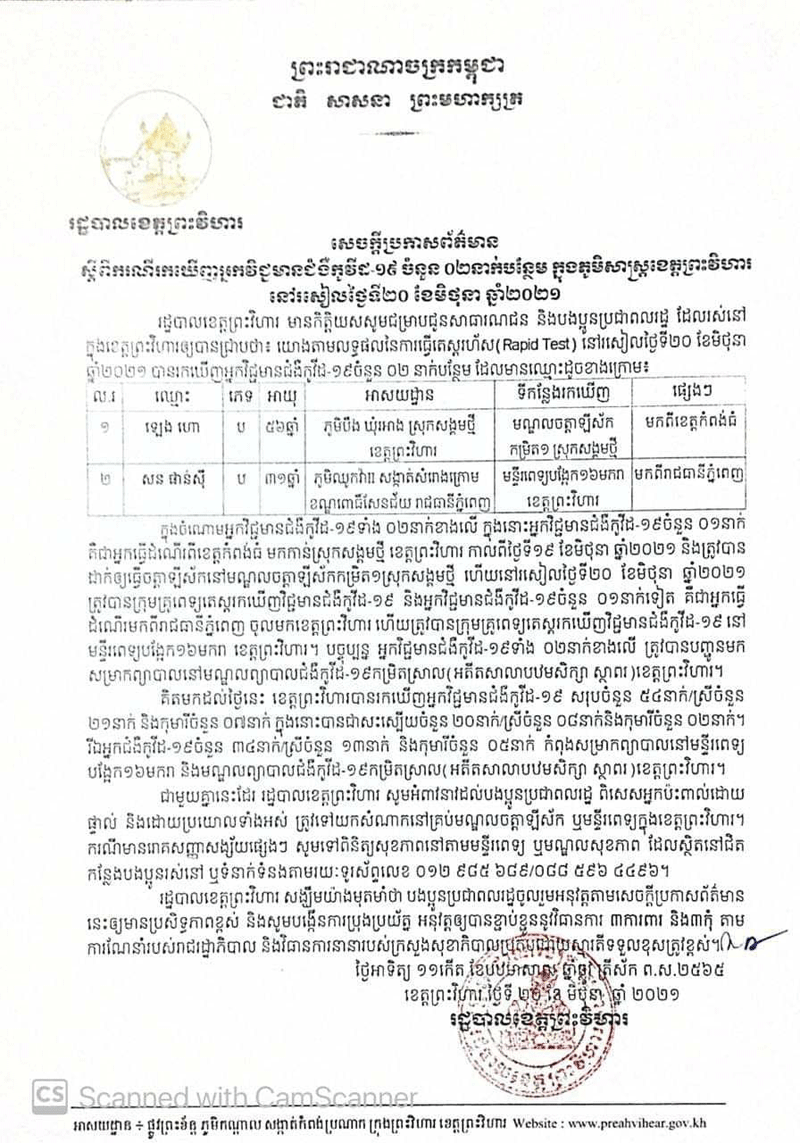រដ្ឋបាលខេត្តព្រះវិហារ រកឃើញវិជ្ជមានកូវីដ១៩ ចំនួន២នាក់ ដែលម្នាក់ធ្វើដំណើ រមកពីរាជធានីភ្នំពេញ និងម្នាក់ទៀតធ្វើ ដំណើរមកពីខេត្តកំពង់ធំ