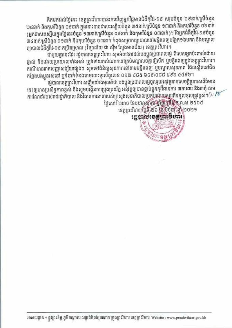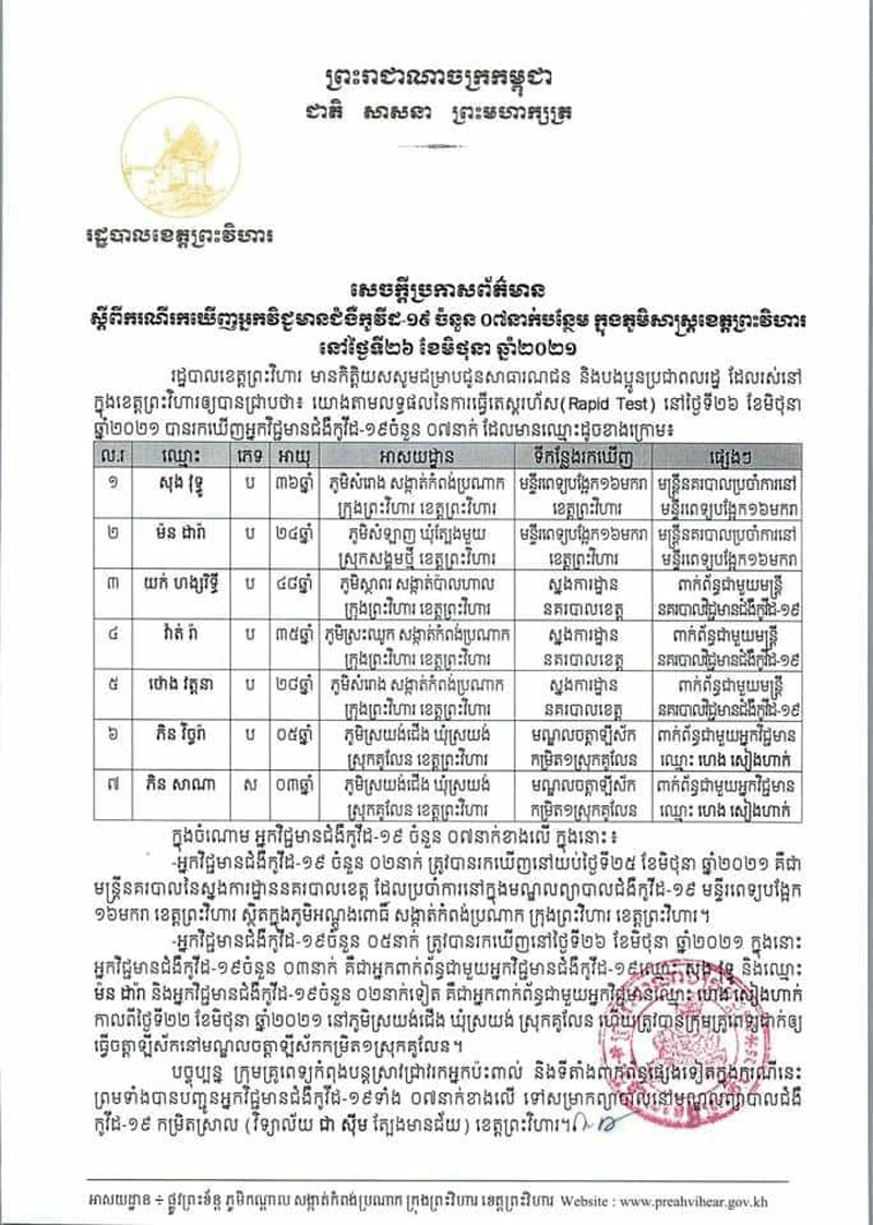 សេចក្តីប្រកាសព័ត៌មានរបស់រដ្ឋបាលខេត្តព្រះវិហារ ស្តីពីករណីរកឃើញអ្នក វិជ្ជមាន កូវីដ១៩ចំនួន០៧នាក់បន្ថែមទៀតក្នុងភូមិសាស្ត្រខេត្តព្រះវិហានៅយប់ថ្ងៃទី២៦ ខែមិថុនា ឆ្នាំ២០២១នេះ៕