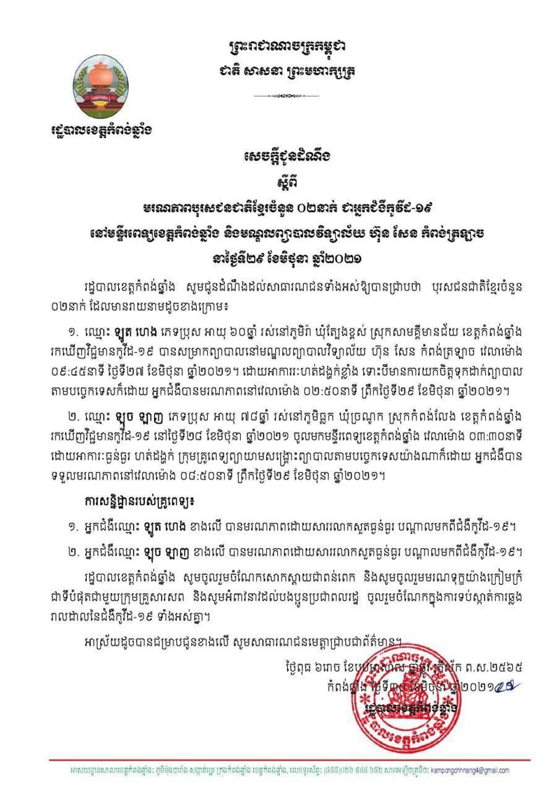 ខេត្តកំពង់ឆ្នាំង:យោងតាមសេចក្តីជូនដំណឹងរបស់រដ្ឋាលខេត្តកំពង់ឆ្នាំងនៅថ្ងៃទី២៩មិថុនា២០២១បានជូនដំណឹងដល់សារធារណះជនទាំងអស់អោយបានជ្រាបថាបុរស២នាក់ទៀតហើយជាអ្នកជម្ងឺកូវិដ១៩បានទទួលមរណះភាពទៀតហើយ ។