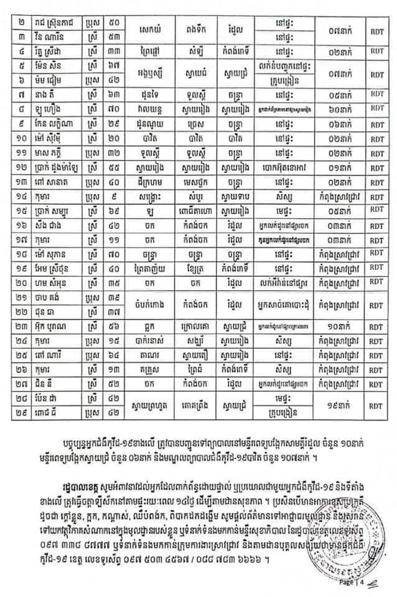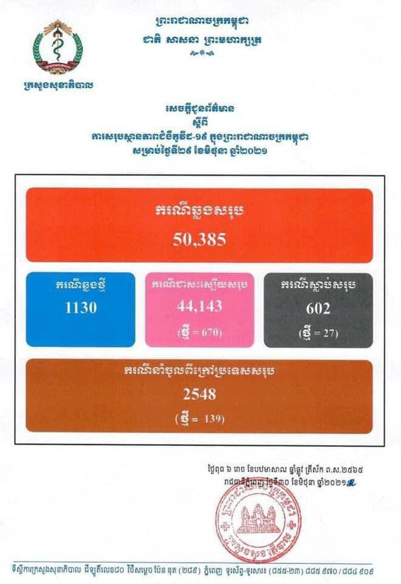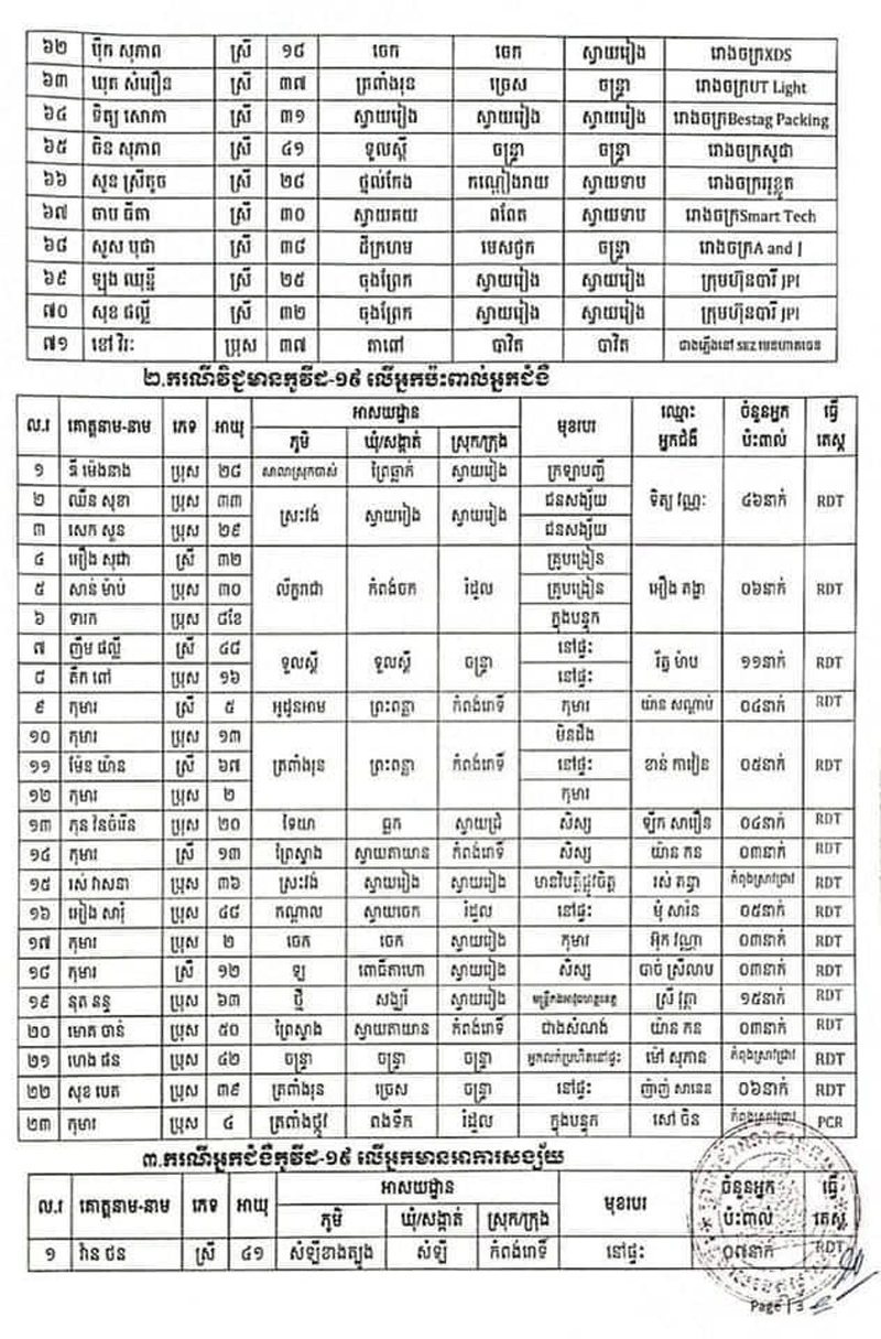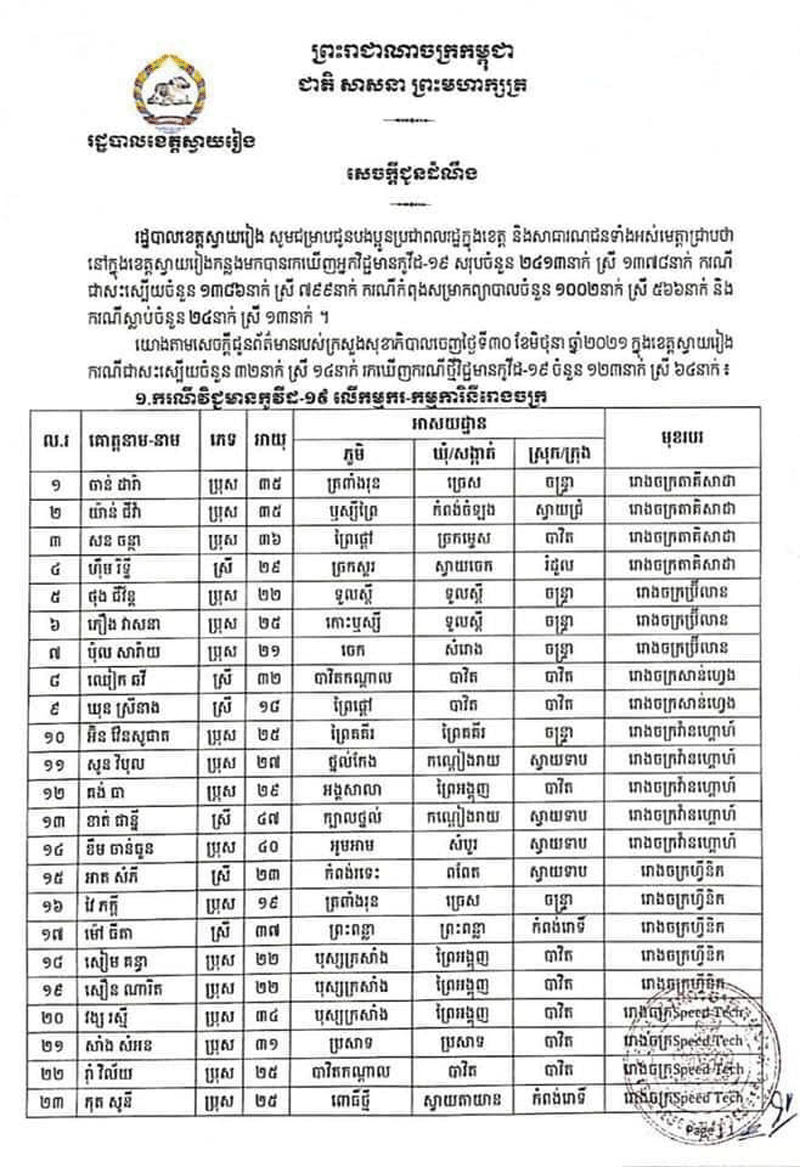 ខេត្តស្វាយរៀង៖នៅថ្ងៃទី៣០មិថុនា២០២១រដ្ឋបាលខេត្តស្វាយរៀងបានប្រកាសអត្តសញ្ញាណអ្នកវិជ្ជមានកូវីដ១៩ ថ្មី ចំនួន១២៣នាក់ស្រី៦៤នាក់« ក្នុងនោះមានកកម្មករ-កម្មការនីរោងចក្រចនួន៧១នាក់ ករណីឆ្លងលើអ្នកប៉ះពាល់ផ្ទាល់ជាមួយអ្នកកូវីដ១៩ចំនួន២៣នាក់ លើអ្នកមានការសង្ស័យ២៩នាក់ វិជ្ជមានកូវីដ១៩»ក្នុងនោះមានក្មេងប្រុសអាយុ០២ឆ្នាំ០២នាក់អាយុ០៤ឆ្នាំម្នាក់អាយុ០៩ម្នាក់អាយុ១៣ឆ្នាំម្នាក់និងទារកអាយុ០៨ខែម្នាក់។ ក្មេងស្រីអាយុ០៥ឆ្នាំ០១នាក់អាយុ០៥ឆ្នាំម្នាក់អាយុ១១ឆ្នាំម្នាក់អាយុ១២ឆ្នាំម្នាក់អាយុ១៣ឆ្នាំ០២នាក់។ករណីស្លាប់ថ្មី០០នាក់