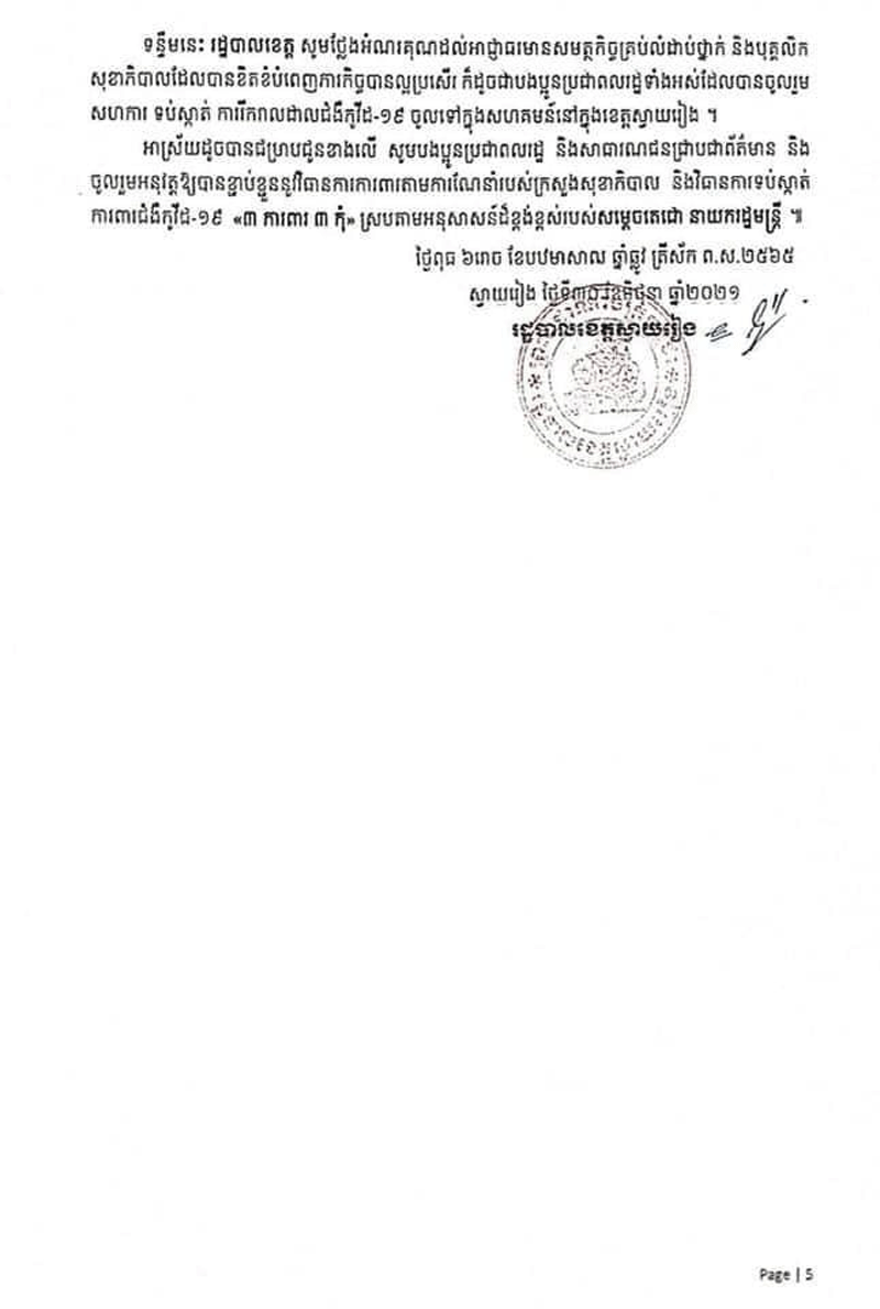 រដ្ឋបាលខេត្តស្វាយរៀងអំពាវនាវដល់បងប្អូនប្រជាពលរដ្ឋ កម្មករ កម្មការិនីដែលពាក់ព័ន្ធជាមួយ អ្នកជំងឺកូវីដ-១៩ចូលមានការប្រុងប្រយត្ន័ដើម្បីទប់ស្កាត់ការឆ្លងរីករាលដាលកូវីដ១៩ទៅសហគមន៍ ហើយបងប្អូនដែលបានពាក់ព័ន្ធជាមួយអ្នកជំងឺកូវីដ-១៩ ខាងលើ ទាំងផ្ទាល់ និងប្រយោល សូមធ្វើចត្តាឡីស័កតាមដានសុខភាព អនុវត្តតាមវិធានការណែនាំរបស់ក្រសួងសុខាភិបាល និងវិធានការ ៣ការពារ ៣កុំ របស់សម្ដេចតេជោហ៊ុនសែន។