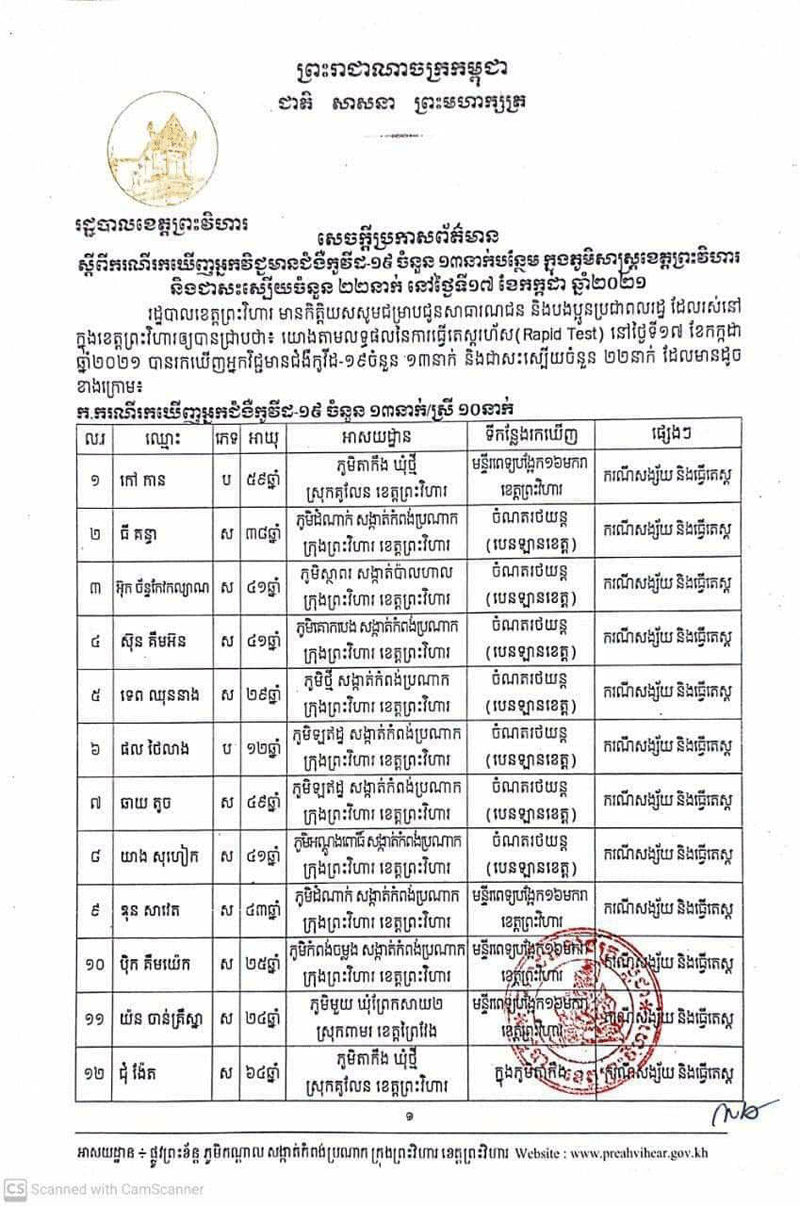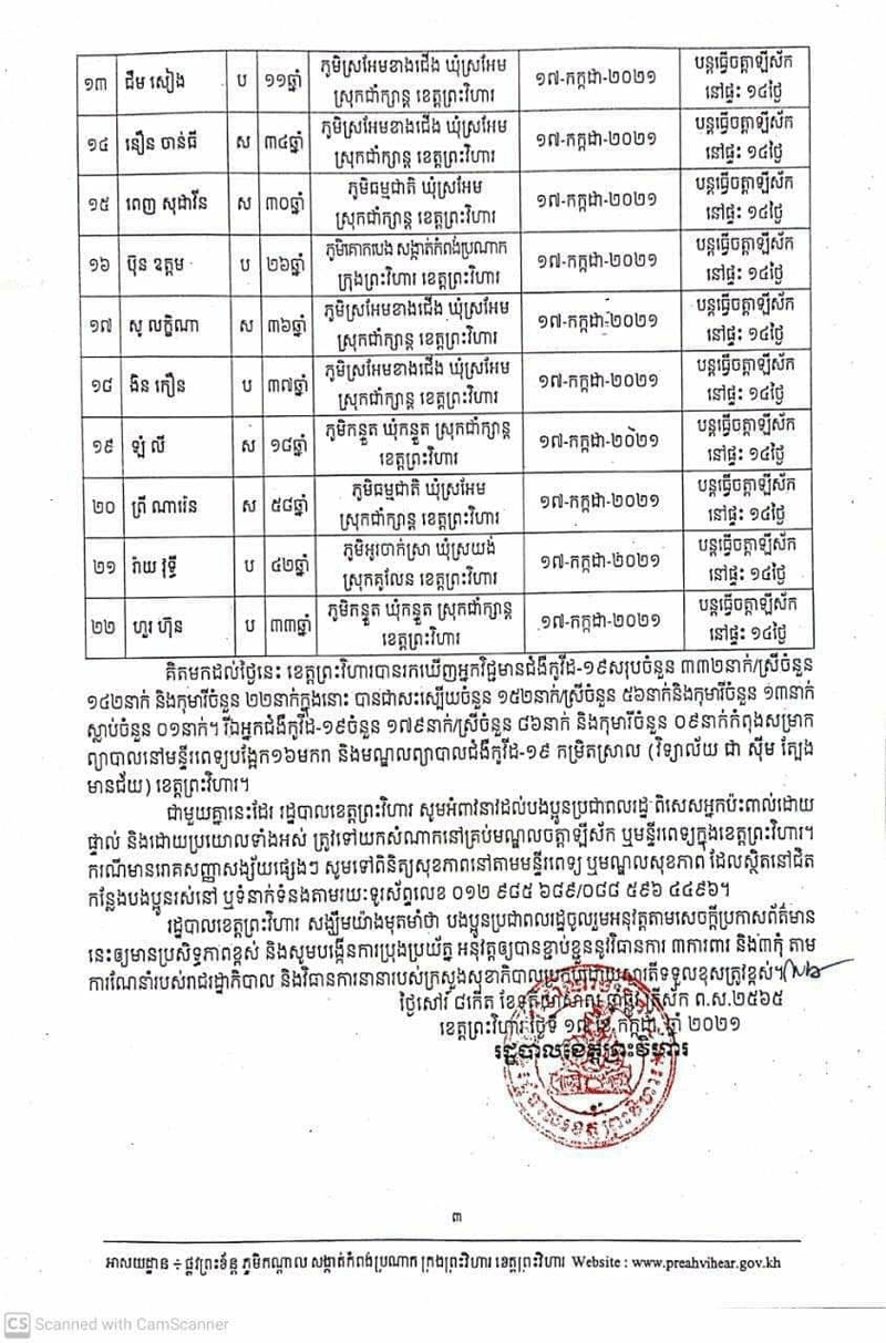 ព្រះវិហារៈនៅថ្ងៃទី១៧ ខែកក្កដា ឆ្នាំ២០២១ នេះខេត្តព្រះវិហារបន្ដរកឃើញ អ្នកមានវិជ្ជមានជំងឺកូវីដ១៩ ចំនួន ១៣នាក់បន្ថែមទៀត និងជាសៈស្បើយចំនួន ២២នាក់ ហើយនៅល្ងាចថ្ងៃទី១៧ ខែកក្កដាឆ្នាំ២០២១ នេះដែរមន្ត្រីសុខាភិបាលនៅមណ្ឌលព្យាបាលកម្រិតស្រាលវិទ្យាល័យជាស៊ីម ត្បែងមានជ័យក៏បាន ជូនដំណើរដល់អ្នកជាសះស្បើយពីជំងឺកូវីដ-១៩ចំនួន២២នាក់វិលត្រឡប់ទៅផ្ទះវិញ ដោយសប្បាយរីករាយ ហើយក៏បានណែនាំអោយពួកគាត់ ត្រូវធ្វើចត្តាឡីស័កនៅផ្ទះចំនួន១៤ថ្ងៃទៀត និងត្រូវអនុវត្ត៣កុំ ៣ការពារ ផងដែរ៕ដោយ សេង ពិសិដ្ឋ