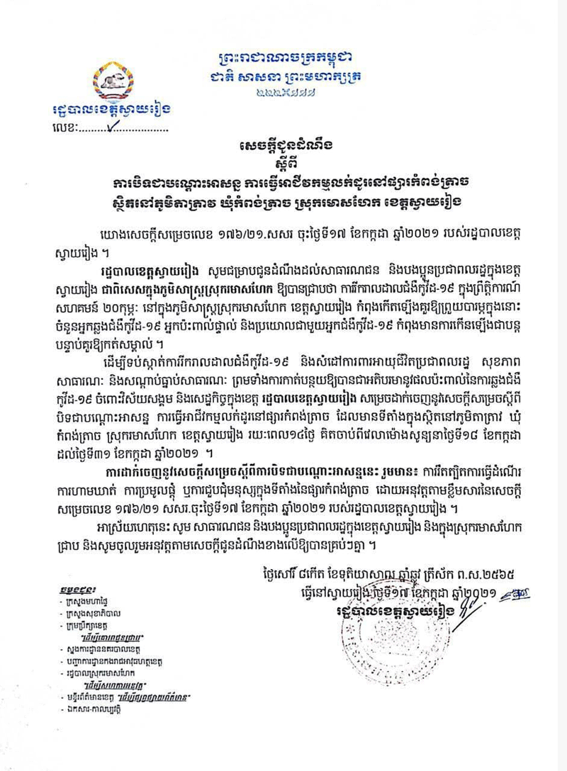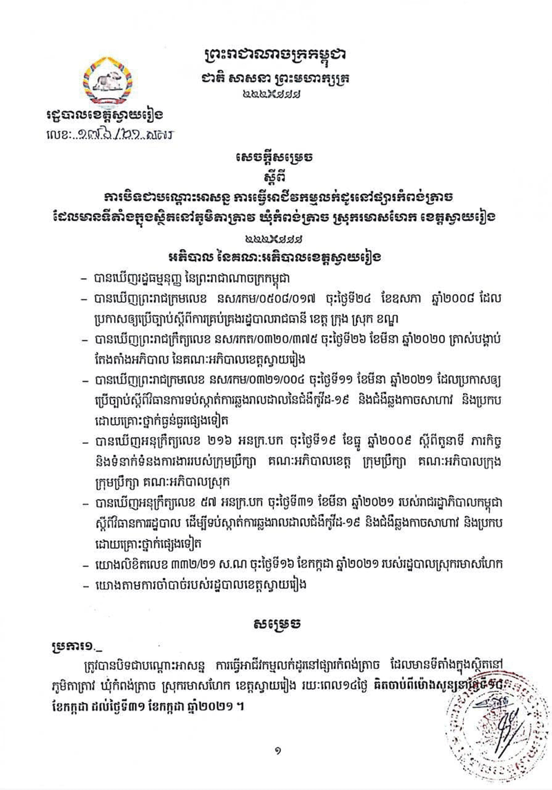 ខេត្តស្វាយរៀង៖យោងតាមរដ្ឋបាលខេត្តស្វាយរៀង បានចេញសេចក្ដីសម្រេចបិទជាបណ្ដោះអាសន្ន ការធ្វើអាជីវកម្មលក់ដូរនៅផ្សារកំពង់ត្រាច ស្ថិតនៅភូមិតាត្រាវ ឃុំកំពង់ត្រាច ស្រុករមាសហែក រយៈពេល១៤ថ្ងៃ គឺចាប់ពីថ្ងៃទី១៨ ដល់ថ្ងៃទី៣១ ខែកក្កដា ឆ្នាំ២០២១និងចេញសេចក្តីជូនដំណឹងដល់បងប្អូនប្រជាពលរដ្ឋ អាជីវករ កម្មករ កម្មការិនី ដែលធ្លាប់ពាក់ព័ន្ធជាមួយឈ្មោះ ជេត សុផល ភេទប្រុស អាយុ ៦៣ឆ្នាំ មុខរបរជាអ្នកលក់ដូរនៅផ្សារកំពង់ត្រាច និងឈ្មោះ ជេត អុន ភេទប្រុស អាយុ ៣៨ឆ្នាំ មុខរបរជាអ្នកលក់ដូរនៅផ្សារកំពង់ត្រាច រស់នៅភូមិតាត្រាវ ឃុំកំពង់ត្រាច ស្រុករមាសហែកផ្សារកំពង់ត្រាច ស្រុករមាសហែក គិតចាប់ពីថ្ងៃទី០១ ខែកក្កដា ឆ្នាំ២០២១។
