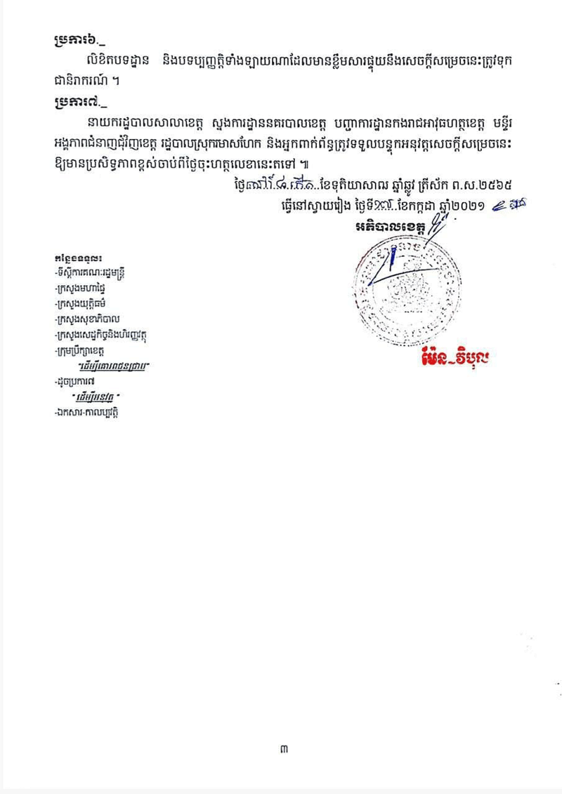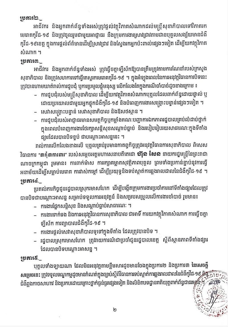 សូមបងប្អូនដែលពាក់ព័ន្ធទាំងផ្ទាល់ និងប្រយោល សូមធ្វើចត្តាឡីស័កតាមដានសុខភាព អនុវត្តតាមវិធានការណែនាំរបស់ក្រសួងសុខាភិបាល និងវិធានការ ៣ការពារ ៣កុំ របស់សម្ដេចតេជោហ៊ុនសែន។