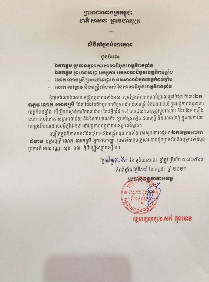 ខេត្តកំពង់ឆ្នាំង៖នៅថ្ងៃទី១៧កក្កដា២០២១ម្សិលមិញនេះអយ្យការអមសាលាខេត្តកំពង់ឆ្នាំងបានឧុបត្ថមនូវម្ហូបអាហារនិងបង្អែមនិងសម្ភារអនាមយ័រួមនិងឧិសថចិនជូនដល់មន្ត្រីនិងជនជាប់ឃុំនៅក្នុងពន្ធនាគាខេត្តកំពង់ឆ្នាំងដើម្បីទុកសម្រាប់ប្រើប្រាស់នៅ គ្រាដែលជម្ងឺដ៍កាចសាហាវមួយនេះកំពង់រាត្បាតយ៉ាងខ្លាំងនិងជួយសម្រួលដល់ការងាររបស់ពន្ធនាគារផងដែរ ។អំណោយដែលបានជួយឧប្ថម្ភនៅពេលនេះមានឧិសថលេបរបស់ចិនសម្រាប់លេបមួយចំនួន សម្ភារអនាម័យជាច្រើនមុខ និងបានឧុបត្ថមម្ហូបអាហារ បង្អែមជូនដល់មន្ត្រីនិងជនជាប់ឃុំក្នុងការពារទប់ស្កាត់ការរីករាលដាលជម្ងឺកូវិដ១៩នៅក្នុងអង្គភាពពន្ធនាគារខេត្តកំពង់ឆ្នាំង។ជាមួយអំណោយដ៍ថ្លៃថ្លា និងចាំបាច់បំផុតនេះថ្នាក់ ដឹកនាំពន្ធនាគារខេត្តកំពង់ឆ្នាំងបានសម្តែងនូវទឹកចិត្តនិងមនោសញ្ជេតនាសោមនស្សរីករាយយ៉ាងខ្លាំងចំពោះការយកចិត្តទុកដាក់ពីសុវត្ថិភាព សុខភាព សុកមាលភាពពីសំណាក់ ថ្នាក់ដឹកនាំដ៏មានគុណធម៌និងដឹងសុខទុក្ខដល់កូនចៅថ្នាក់ក្រោម! សូមថ្លែងអំណរគុណឯកឧត្តមប្រធានសាលាដំបូងនិងឯកឧត្តមព្រះរាជអាជ្ញាខេត្តកំពង់ឆ្នាំងដែលបាន យកចិត្តទុកដាក់ដល់ថ្នាក់ដឹកនាំ មន្ត្រីពន្ធនាគារខេត្ត និងជនជាប់ឃុំទាំងអស់ ។ថ្នាក់ដឹកនាំពន្ធនាគារខេត្តកំពង់ឆ្នាំងថ្លែងអំណរគុណ និងជូនពរ ថ្នាក់ដឹកនាំសាលាដំបូងខេត្ត និងអយ្យការអមសាលាដំបូងខេត្តកំពង់ឆ្នាំង សហការីទាំងអស់បានព្រមទាំងក្រុមគ្រួសារ សូមជួបប្រទះនូវ ពុទ្ធពរទាំងបួនប្រការគឺ អាយុ វណ្ណៈ សុខៈ ពលៈ កុំបីឃ្លៀងឃ្លាតឡើយ៕ សុក្ខាររិន