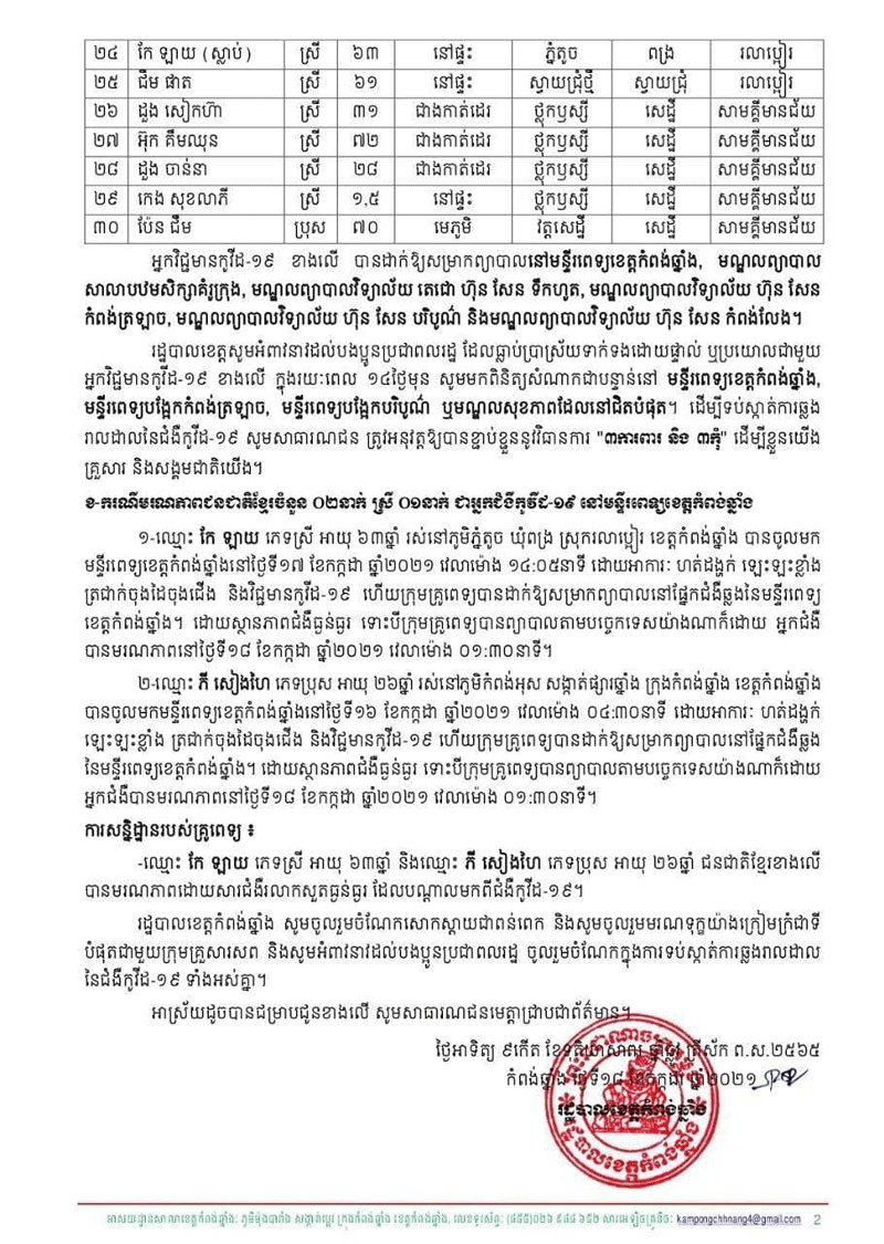 សូមបញ្ជាក់ផងដែរថាមានករណីមរណះភាពប្រុសស្រី២នាក់ជនជាតិខ្មែរទៀតហើយដែលជាអ្នកជម្ងឺកូវិដ១៩នៅមន្ទីពេទ្យខេត្តកំពង់ឆ្នាំងមានឈ្មោះ កែវឡាយ ភេទស្រីអាយុ៦៣ឆ្នាំរស់នៅក្នុង.ភូមិ ភ្នំតូច.ឃុំ ពង្រ.ស្រុករលាប្អៀរខេត្តកំពង់ឆ្នាំង. បានចូលមកសម្រាកព្យាបាលនៅមន្ទីរពេទ្យខេត្តកំពង់ឆ្នាំងនៅថ្ងៃទី ១៧កក្កដា 2021 វេលាម៉ោង ២និង៥នាទីដោយអាការហត់ដកដង្ហើមឡេះឡះខ្លាំងត្រជាក់ចុងដៃជើងនិងវិជ្ជមានកូវីត19 ហើយក្រុមគ្រួពេទ្យបានដាក់អោយសម្រាកព្យាបាលនៅផ្នែកជម្ងឺឆ្លងនៃមន្ទីពេទ្យខេត្តកំពង់ឆ្នាំង។