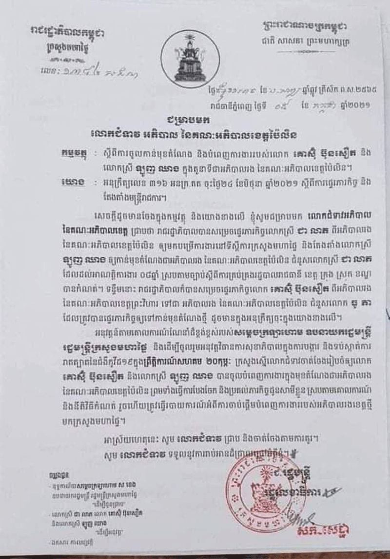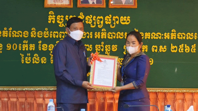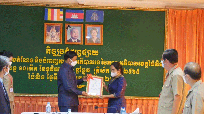 ខេត្តប៉ៃលិន ៖ នៅរសៀលថ្ងៃចន្ទ ១០កើត ខែទុតិយាសាឍ ឆ្នាំឆ្លូវ ត្រីស័ក ព.ស ២៥៦៥ ត្រូវនឹងថ្ងៃទី១៩ ខែកក្កដា ឆ្នាំ២០២១ លោកជំទាវ បាន ស្រីមុំ អភិបាលខេត្តប៉ៃលិន ឯកឧត្តម ជា ចាន់ឌិន ប្រធានក្រុមប្រឹក្សាខេត្ត បានអញ្ជើញជាអធិបតីក្នុងពិធីប្រកាសចូលកាន់មុខតំណែងអភិបាលរងខេត្តប៉ៃលិន នៅក្នុងបរិវេណសាលាខេត្តប៉ៃលិន ។