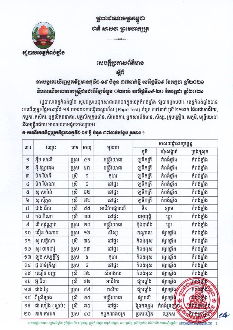 ខេត្តកំពង់ឆ្នាំង:បើយោងតាមសេចក្តីប្រកាស់ព័ត៌មានរបស់សាលាខេត្តកំពង់ឆ្នាំងដែល ទទួលបាននៅថ្ងៃទី១៩និង២០កក្កដា២០២១ រដ្ឋបាលខេត្តកំពង់ឆ្នាំង បានចេញសេចក្តីប្រកាសព័ត៌មាន ស្តីពីការបន្តរកឃើញអ្នកវិជ្ជមានកូវីដ-១៩ក្នុងព្រឹត្តិការណ៍សហគមន៍ 20 កុម្ភៈនៅក្នងខេត្តកំពង់ឆ្នាំងរកឃើញអ្នកវិជ្ជមានកូវីដ19 ចំនួន៣៨នាក់បន្ថែមទៀតក្នុងនោះស្រី២១នាក់តាមរយះការធ្វើតេស្តរហ័សដែលមានអាជីវករ.កម្មករ.កសិក.បុកគ្គលឹគធនាគារ.បុគ្គលឹកក្រុមហ៊ុន.អ្នកសំអាងការ.អ្នកសារព័ត៌មាន.សិស្ស.គ្រូបង្រៀន.មេភូមិ.មន្ត្រីយោធា.និងមន្ត្រីរាជការ.ផងដែរ.ក្នុងនោះមានករណីមរណះភាពស្ត្រី២នាក់ម្នាក់ទៀតហើយនៅថ្ថៃថ្ងៃទី២០កក្កដា២០២១គ្រាដែរបន្តរកឃើញអ្នកមានវិរុសកូវិដ១៩គ្មានការស្រាកស្រានដែលធ្វើអោយមានការព្រួយបារម្មណ៍ខណះការរកឃើញនៅតែមានបន្តបន្ទាប់ ។