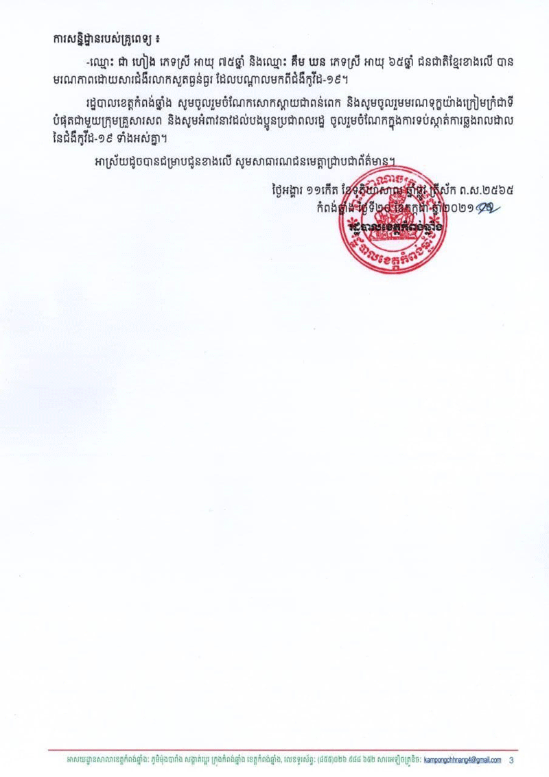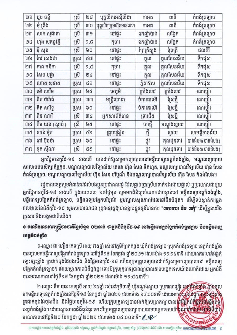 សូមបញ្ជាក់ផងដែរថាមានករណីមរណះភាពប្រុសស្រី២នាក់ជនជាតិខ្មែរទៀតហើយដែលជាអ្នកជម្ងឺកូវិដ១៩នៅមន្ទីពេទ្យខេត្តកំពង់ឆ្នាំងមានឈ្មោះ ជាហៀង ភេទស្រីអាយុ៧៥ឆ្នាំរស់នៅក្នុង.ភូមិព្រែគន្លង.ឃុំ កំពង់ត្រឡាច.ស្រុកកំពង់ត្រឡាច.ខេត្តកំពង់ឆ្នាំង. បានចូលមកសម្រាកព្យាបាលនៅមន្ទីរពេទ្យខេត្តកំពង់ឆ្នាំងនៅថ្ងៃទី ១៩កក្កដា 2021 វេលាម៉ោង ១១និង១៥នាទីដោយអាការហត់ដកដង្ហើមឡេះឡះខ្លាំងត្រជាក់ចុងដៃជើងនិងវិជ្ជមានកូវីត19 ហើយក្រុមគ្រួពេទ្យបានដាក់អោយសម្រាកព្យាបាលនៅផ្នែកជម្ងឺឆ្លងនៃមន្ទីពេទ្យខេត្តកំពង់ឆ្នាំង។