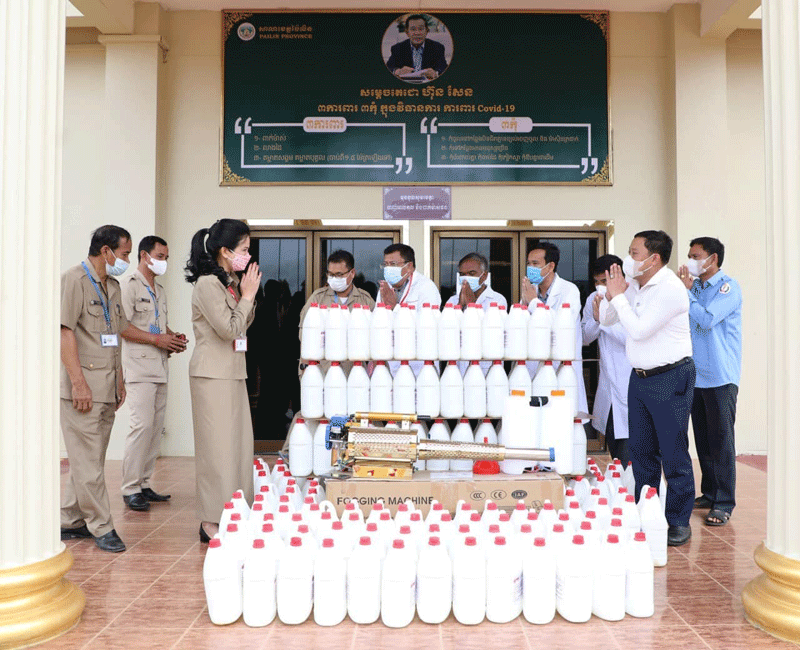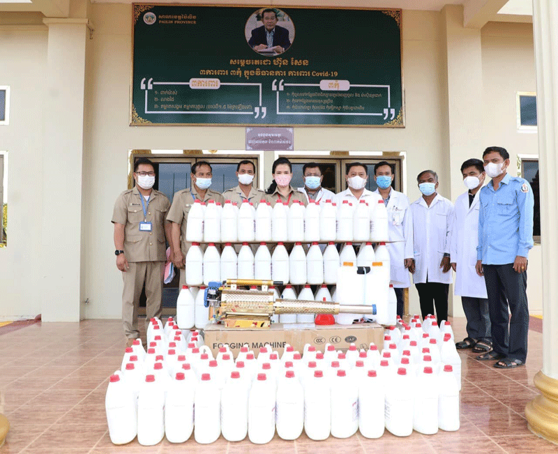 លោកជំទាវ បាន ស្រីមុំ អភិបាលខេត្តប៉ៃលិន បានប្រគល់សម្ភារៈទាំងអស់នោះដល់ក្រុមការងារដើម្បីយកទៅបាញ់ សម្លាប់មេរោគ ដោយមានវត្តមាន លោក ស្លេះ យូ ប្រធានមន្ទីរសុខាភិបាលខេត្តប៉ៃ លិន ក្រុមការងារមន្ទីសុខាភិបាលខេត្ត និងមន្ត្រីជាច្រើនរូបទៀត ។
