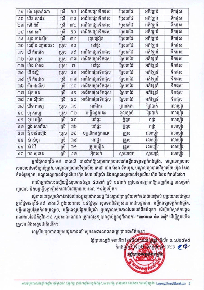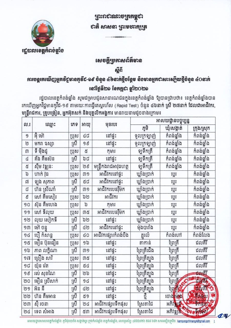 ខេត្តកំពង់ឆ្នាំង: រដ្ឋបាលខេត្តកំពង់ឆ្នាំង សូមជម្រាបជូនសាធារណជនក្នុងខេត្តកំពង់ឆ្នាំង ឱ្យបានជ្រាបថា៖ ខេត្តកំពង់ឆ្នាំងបាន រកឃើញអ្នកវិជ្ជមានកូវីដ-១៩ តាមរយៈការធ្វើតេស្តរហ័ស (Rapid Test) ចំនួន ៤៦នាក់ ស្រី ២៧នាក់ ដែលជាអាជីវករ, មន្ត្រីរាជការ, គ្រូបង្រៀន, អ្នកអ៊ុតសក់ និងបុគ្គលិកអង្គការ ដែលយើងទទួលបាននៅថ្ងៃទី២២កក្កដា២០២១នេះផងដែរ ។បើយោងតាមរបាយការរបស់រដ្បាលខេត្តកំពង់ឆ្នាំងអ្នកវិជ្ជដែលមានកូវីដ-១៩ ខាងលើ បានដាក់ឱ្យសម្រាកព្យាបាលនៅមន្ទីរពេទ្យខេត្តកំពង់ឆ្នាំង, មណ្ឌលព្យាបាល សាលាបឋមសិក្សាគំរូក្រុង, មណ្ឌលព្យាបាលវិទ្យាល័យ តេជោ ហ៊ុន សែន ទឹកហូត, មណ្ឌលព្យាបាលវិទ្យាល័យ ហ៊ុន សែន កំពង់ត្រឡាច, មណ្ឌលព្យាបាលវិទ្យាល័យ ហ៊ុន សែន បរិបូណ៌ និងមណ្ឌលព្យាបាលវិទ្យាល័យ ហ៊ុន សែន កំពង់លែង។ក្នុងករណីអ្នកជាសះស្បើយថ្មីសរុបមានចំនួន ៤០នាក់ ស្រី ១៨នាក់ ត្រូវបានអនុញ្ញាតឱ្យចេញពីមណ្ឌលសម្រាក ព្យាបាល និងបន្តធ្វើចត្តាឡីស័កនៅលំនៅដ្ឋានរយៈពេល ១៤ថ្ងៃបន្តទៀត។រដ្ឋបាលខេត្តសូមអំពាវនាវដល់បងប្អូនប្រជាពលរដ្ឋ ដែលធ្លាប់ប្រាស្រ័យទាក់ទងដោយផ្ទាល់ ឬប្រយោលជាមួយ អ្នកវិជ្ជមានកូវីដ-១៩ ខាងលើ ក្នុងរយៈពេល ១៤ថ្ងៃមុន សូមមកពិនិត្យសំណាកជាបន្ទាន់នៅ មន្ទីរពេទ្យខេត្តកំពង់ឆ្នាំង, មន្ទីរពេទ្យបង្អែកកំពង់ត្រឡាច, មន្ទីរពេទ្យបង្អែកបរិបូណ៌ ឬមណ្ឌលសុខភាពដែលនៅជិតបំផុត ដើម្បីទប់ស្កាត់ការឆ្លង រាលដាលនៃជំងឺកូវីដ-១៩ សូមសាធារណជន ត្រូវអនុវត្តឱ្យបានខ្ជាប់ខ្ជួននូវវិធានការ “៣ការពារ និង ៣កុំ” ដើម្បីខ្លួនយើង គ្រួសារ និងសង្គមជាតិយើង៕សុក្ខារិន