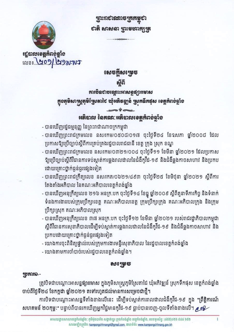 ខេត្តកំពង់ឆ្នាំង:បើយោងតាមសេចក្តីសម្រេចរបស់រដ្ឋបាលខេត្តកំពង់ឆ្នាំងដែលទទួលបាននៅថ្ងៃទី២៤កក្កដា២០២១ម្សិលមិញស្ដីពីការបិទជាបណ្ដោះអាសន្ននៅទីតាំងផ្សាររមាសក្នុងភូមិសាស្ត្រភូមិស្រែតាជៃឃុំអភិវឌ្ឍន៍ស្រុកទឹកផុសខេត្តកំពង់ឆ្នាំងរហូតដល់មានសម្រេចជាថ្មី ។