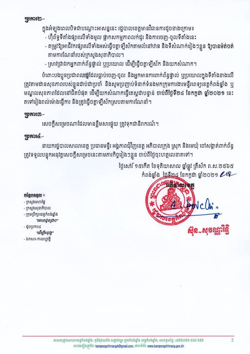 ទី២តម្រូវឲ្យអាជីវករទាំងអស់ធ្វើចិត្តាឡីស័កតាមលំនៅឋាននិងទីសំណាក់រៀងរៀងខ្លួនឲ្យបានហ្មត់ចត់តាមការណែនាំរបស់ក្រសួងសុខាភិបាល ។
