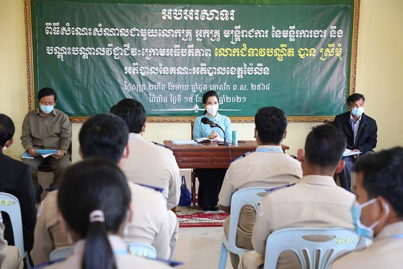 (ខេត្តប៉ៃលិន) ៖ កាលពីរសៀលថ្ងៃសុក្រ ថ្ងៃទី១៥ ខែមករា ឆ្នាំ២០២១ អភិបាល នៃគណៈអភិបាលខេត្តប៉ៃលិន បណ្ឌិត បាន ស្រីមុំ បានអញ្ជើញជួបសំណេះសំណាល សួរសុខទុក្ខ ថ្នាក់ដឹកនាំ មន្រ្តីរាជការ ចំនួនពីរមន្ទីរផ្សេងគ្នា គឺមន្ទីរកសិកម្ម រុក្ខាប្រមាញ់ និងនេសាទ និងមន្ទីរការងារ និងបណ្តុះបណ្តាលវិជ្ជាជីវៈ ខេត្តប៉ៃលិន ។លោកជំទាវ បាន ស្រីមុំ អភិបាលខេត្ត បានផ្ញើសារទៅប្រធានមន្ទីរអង្គភាពថា សូមកុំឡូយឆាយនឹងសម្ភារៈនិយមទំនើបៗ ឯកូនចៅ និងកន្លែងធ្វើការមើលមិនយល់ គ្មានសណ្តាប់ធ្នាប់ របៀបរៀបរយ ត្រូវចេះស្រឡាញ់កន្លែងធ្វើការ អោយដូចជាស្រឡាញ់ផ្ទះរបស់ខ្លួនឯងដែរ ចំពោះក្នុងកិច្ចប្រជុំសំណេះសំណាលនេះដែរលោកជំទាវអភិបាលខេត្ត ជួបជាមួយនឹងមន្ទីរពាក់ព័ន្ធនីមួយៗដើម្បីសម្រួល បែបបទរដ្ឋបាលផ្សេងៗ ដើម្បីឲ្យការងារ បានដំណើរការទៅយ៉ាងរលូនក្នុងការបំរើសេវាការងារឱ្យមានភាពទទួលខុសត្រូវ និងមានតម្លាភាព ។