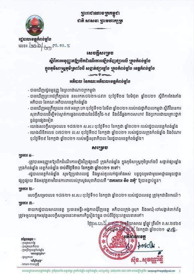 ខេត្តកំពង់ឆ្នាំង:រដ្ឋបាលសាលាខេត្តកំពង់ឆ្នាំងបានសម្រេចអនុញ្ញាតបើកឲ្យដំណើរការលក់ដូរឡើងវិញនៅផ្សាលើក្រុងកំពង់ឆ្នាំង ដែលមានទីតាំងភូមិស្ថិតក្នុងភូមិត្រពាំងបី សង្កាត់ផ្សារឆ្នាំង ក្រុងកំពង់ឆ្នាំងនិងខេត្តកំពង់ឆ្នាំង បន្ទាប់ពីបានបិទអស់១រយៈដោយសារតែមានអាជីវករឆ្លងកូវីដ-19 ។នៅក្នុងសេចក្តីជូនដំណឹងរបស់រដ្ឋបាលខេត្តកំពង់ឆ្នាំងបានបញ្ជាក់ដែរថា៖ ផ្សាលើក្រុងកំពង់ឆ្នាំង ចាប់បើកឲ្យដំណើរការឡើងវិញចាប់ពីថ្ងៃទី ៣០ ខែកក្កដានេះតទៅ ហើយជាមួយគ្នានេះរដ្ឋបាលខេត្តសូមឱ្យប្រជាពលរដ្ឋ ម្ចាស់តូបលក់ដូរទាំងអស់ ត្រូវបន្តចូលរួមជាមួយអាជ្ញាធរមូលដ្ឋាន ផ្សព្វផ្សាយ និងអនុវត្តវិធានការរបស់ប្រមុខរាជរដ្ឋាភិបាលក៍ដូចជាក្រសួងសុខាភិបាល ៣ការពារ និង៣កុំ ឲ្យបានខ្ជាប់ខ្ជួន ។ប្រធានមន្ទីរសុខាភិបាលខេត្តកំពង់ឆ្នាំង បានប្រាប់អោយដឹងតាមទូរសព្ទ័ថា៖ មុនដាក់ឱ្យដំណើរការឡើងវិញ នៅក្នុងទីបរិវេណផ្សារលើក្រុងកំពង់ឆ្នាំង មន្ត្រីជំនាញរបស់មន្ទីរ សុខាភិបាលខេត្ត បានចុះបាញ់ថ្នាំសម្លាប់មេរោគ ជាមុនសិន។ហើយជាមួយគ្នានេះ ក្នុងនាមមន្ទីរសុខាភិបាលក៍សូមអំពាវនាវដល់បងប្អូនអាជីវករលក់ដូរក្នុងផ្សារលើ ត្រូវអនុវត្តឱ្យបាននូវវិធានការនានាសម្រាប់ការទប់ស្កាត់ការរីករាលដាលឆ្លងនូវ ជម្ងឺកូវីត-១៩ផងដែរ។គួបញ្ជាក់ផងដែរថាៈ ផ្សារលើក្រុងកំពង់ឆ្នាំងបានបិទមិនឱ្យអាជីវករចូលលក់ដូរ ចាប់ពីថ្ងៃទី ១០ ខែកក្កដាឆ្នាំ២០២១ បន្ទាប់ពីមន្ត្រីនៃមន្ទីរសុខាភិបាលខេត្តកំពង់ឆ្នាំង បានយកសំណាក់លើកទី១ រកឃើញអាជីវករ វិជ្ជមានកូវីត-១៩ចំនួន២២នាក់(ស្រី១៧នាក់) ក្នុងចំណោម ២២៥នាក់ លើលទ្ឋផលតេសរហ័សកាលពីថ្ងៃទី០៩ ខែកក្កដា គឺមុន១ថ្ងៃនៃការបិទផ្សារលើនេះ។បន្ទាប់មកទៀត នៅថ្ងៃទី២២ ខែកក្កដា ក្រុមមន្ត្រីនៃមន្ទីរសុខាភិបាលខេត្តកំពង់ឆ្នាំងបានចុះយកសំណាក លើអាជីវករ ក្នុងផ្សារលើ ជាលើកទី ២ទៀត ជាលទ្ឋផល រកឃើញចំនួន១១នាក់ លើក្រុមអាជីវករ ២៤៨នាក់។ ដោយលទ្ឋផល នៅតែបន្តរកឃើញ អ្នកវិជ្ជមានបែបនេះទើប រដ្ឋបាលខេត្តកំពង់ឆ្នាំង បានបន្តបិទផ្សារលើ បន្ថែម១សប្តាហ៍បន្តទៀត ។នៅថ្ងៃទី ២៨ ខែកក្កដា មន្ត្រីជំនាញសុខាភិបាលក៍បានបន្តចុះយកសំណាកលើអាជីវករផ្សារលើ ជាលើកទី ៣បន្តទៀត ដែលជាលទ្ឋផល លើអាជីវករ ២០៩នាក់បានរកឃើញអ្នកវិជ្ជមានចំនួន ៦ នាក់បន្ថែមទៀត ។សរុបការយកសំណាកទាំង៣លើក ជាលទ្ឋផលលើតេសរហ័ស មន្ត្រីជំនាញរកឃើញ អ្នកវិជ្ជមាន ចំនួន៣៩នាក់។ តែបើទោះជាយ៉ាងនេះក្តីរដ្ឋបាលខេត្តកំពង់ឆ្នាំងបានសម្រេចបើកឲ្យដំណើរការផ្សារលើ ក្រុងកំពង់ឆ្នាំង ឡើងវិញ នៅថ្ងៃទី៣០ ខែកក្កដានេះបន្ទាប់ពីបិទរយៈពេល ២០ថ្ងៃបន្តមក ៕សុក្ខារិន
