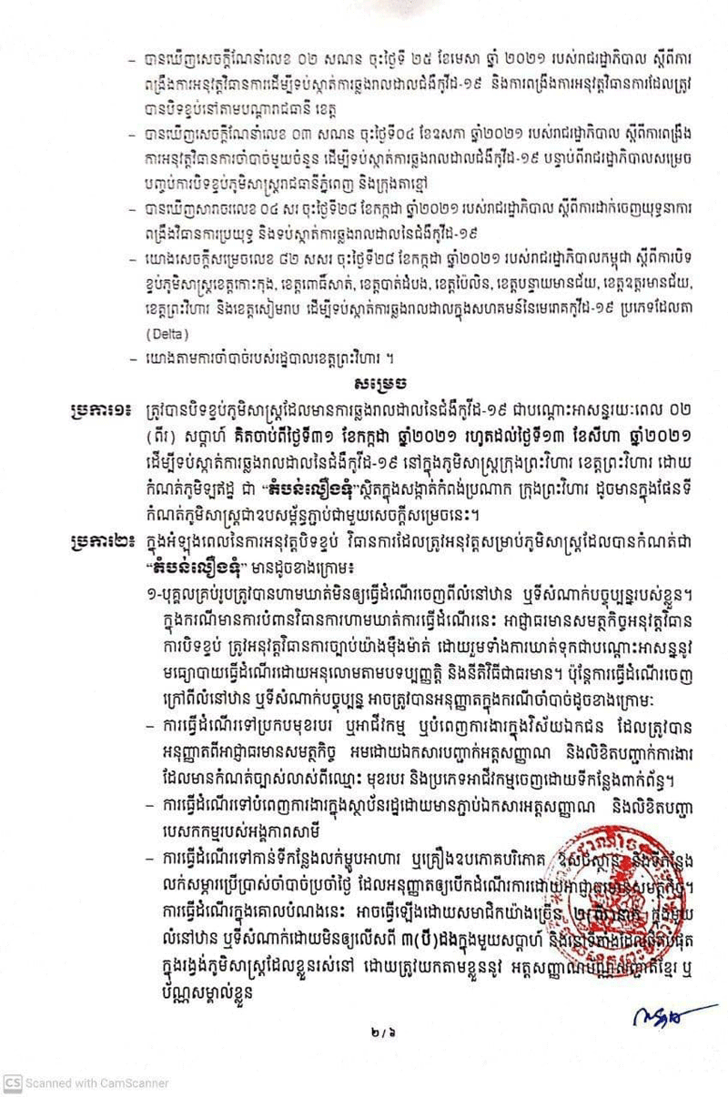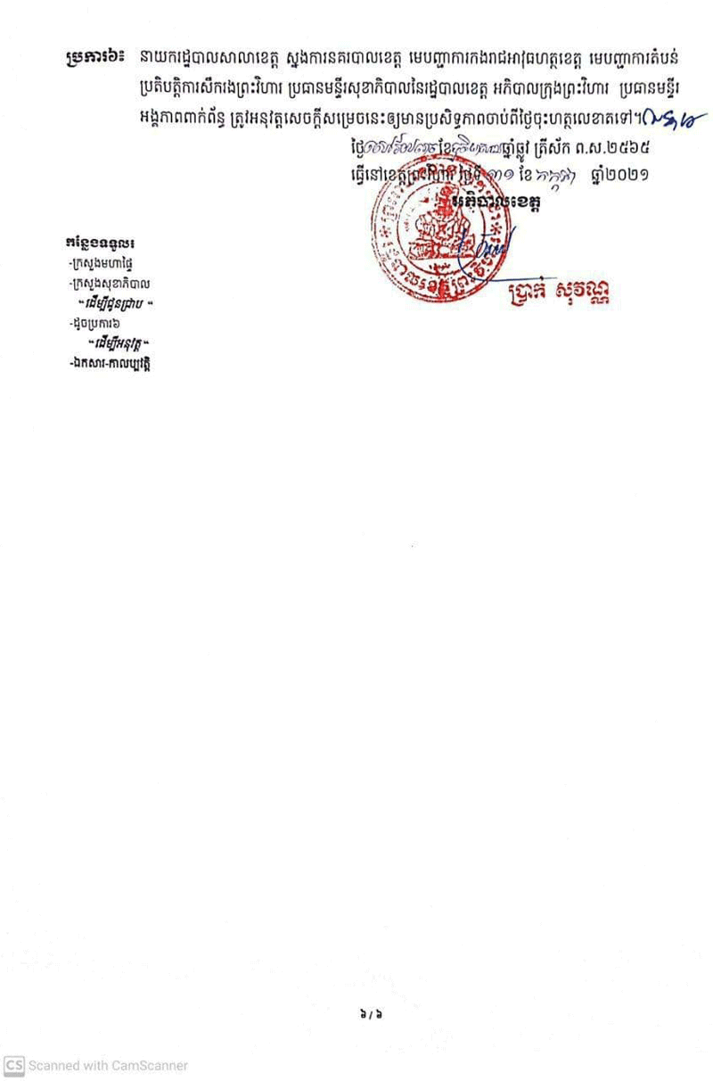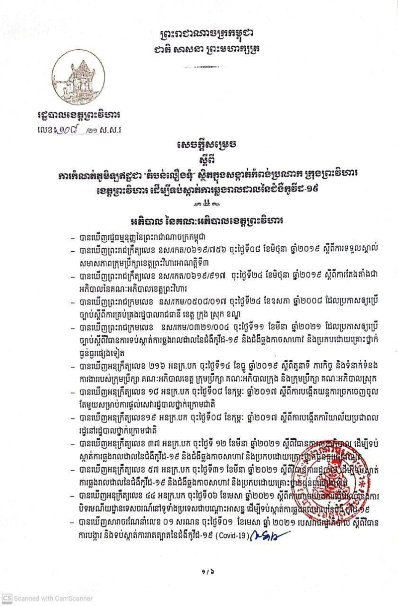 សេចក្តីសម្រេចរបស់រដ្ឋបាលខេត្តព្រះវិហារ ស្តីពីការកំណត់ភូមិឡឥដ្ឋជា (តំបន់លឿងទុំ) ស្ថិតនៅក្នុងសង្កាត់កំពង់ប្រណាក ក្រុងព្រះវិហារ ខេត្តព្រះវិហារ ដើម្បីទប់ស្គាត់ការឆ្លងរាលដាលនៃជំងឺកូវីដ19។