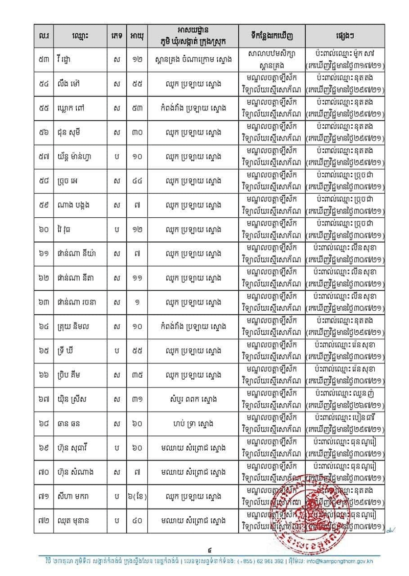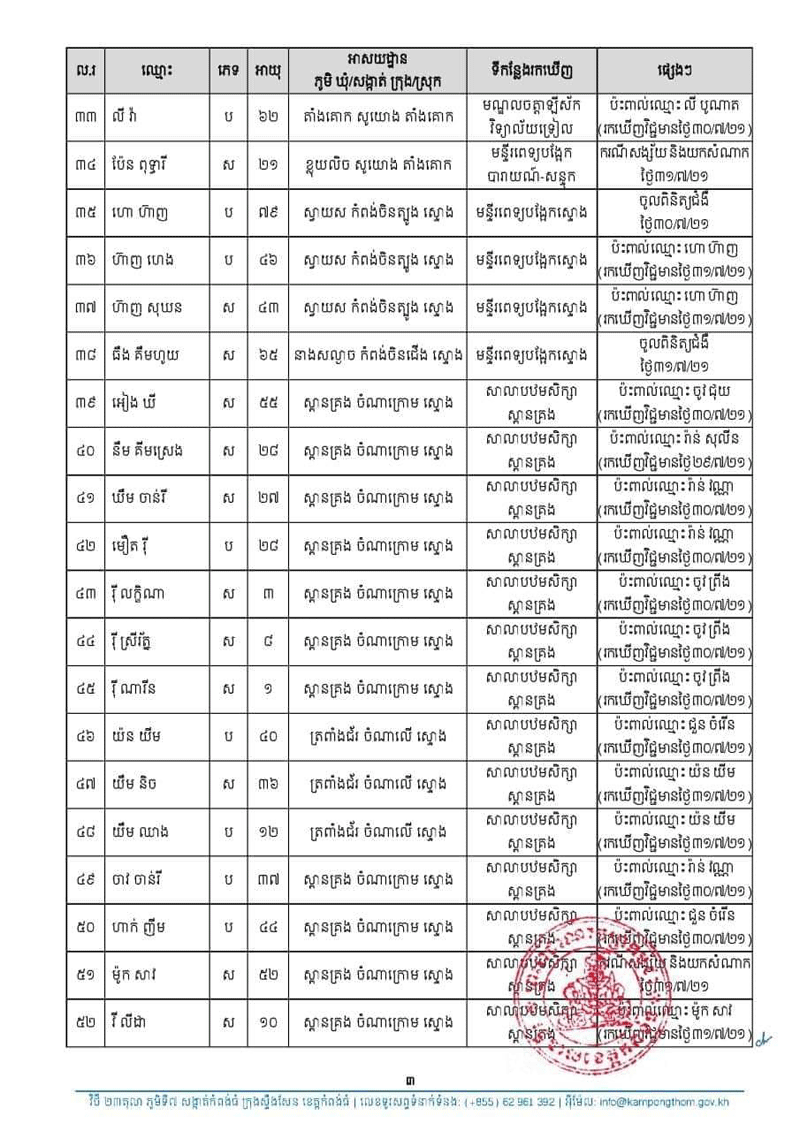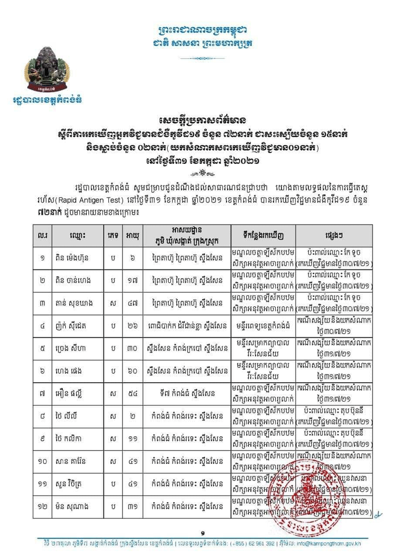 រដ្ឋបាលខេត្តកំពង់ធំ បានប្រកាសរកឃើញអ្នកវិជ្ជមានជំងឺកូវីដ១៩ចំនួន ៧២នាក់ ជាសះស្បើយចំនួន ១៥នាក់ និងស្លាប់ចំនួន ០២នាក់ នៅថ្ងៃទី៣១ ខែកក្កដា ឆ្នាំ២០២១