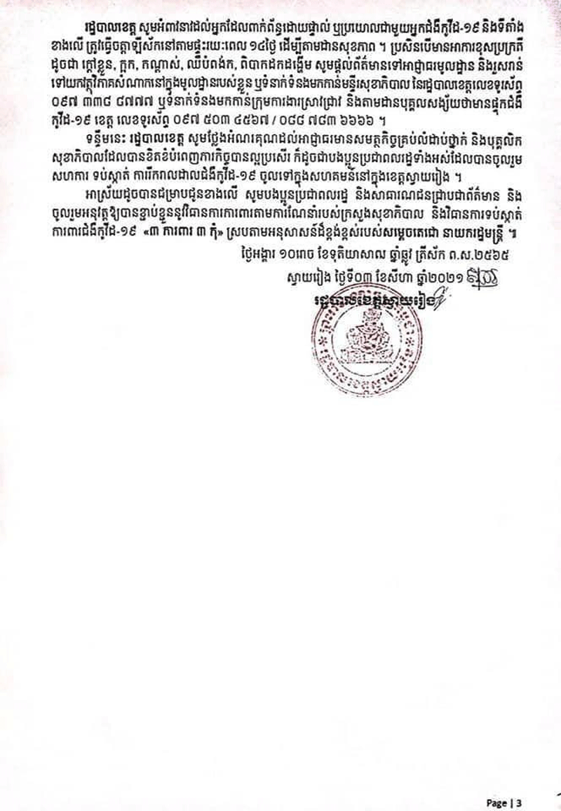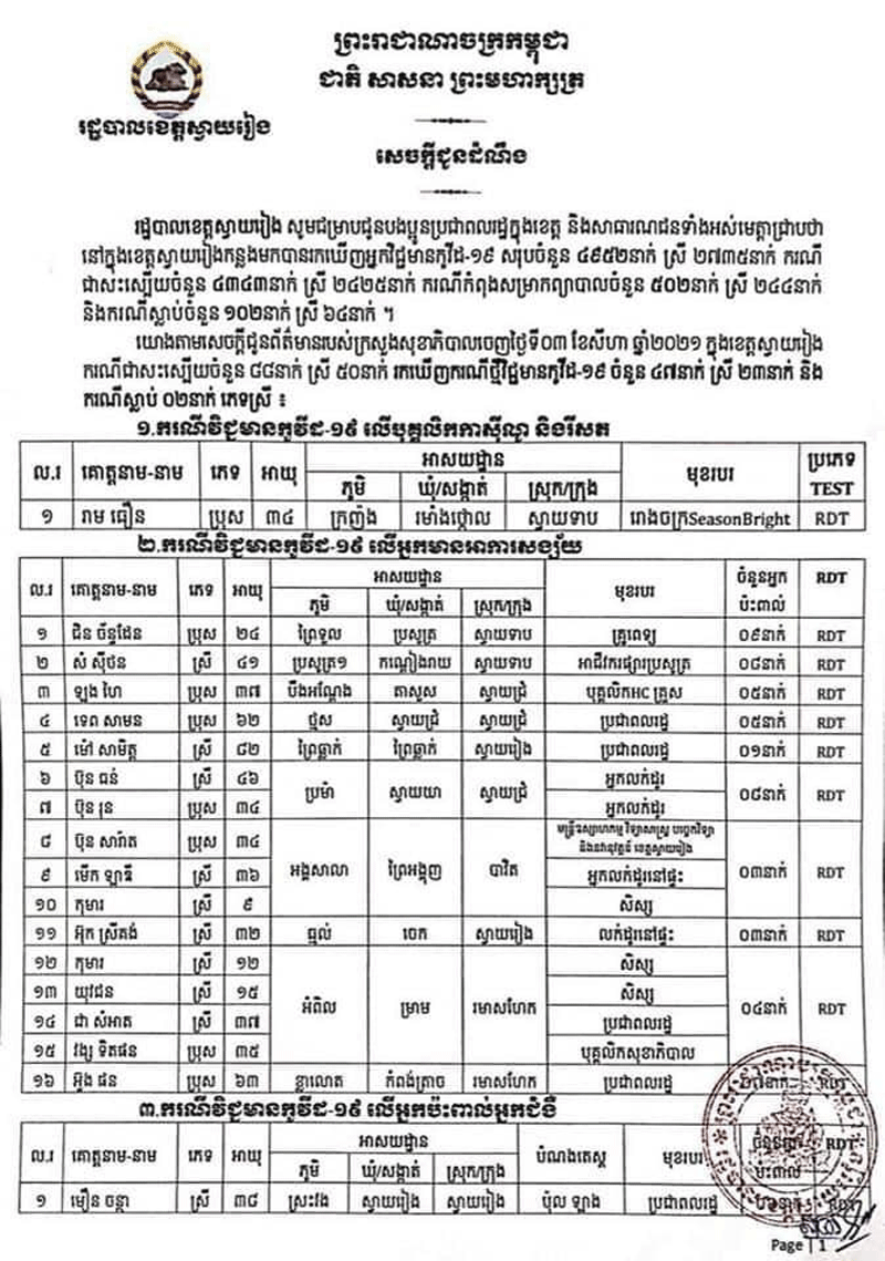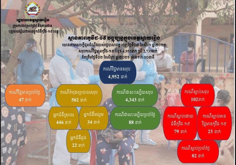 ខេត្តស្វាយរៀង៖យោងតាមសេចក្តីជួនដំណឹងរបស់រដ្ឋបាលខេត្តស្វាយរៀងនៅថ្ងៃទី០៣សីហា ២០២១នេះរដ្ឋបាលខេត្តស្វាយរៀងបានប្រកាស់អត្តសញ្ញាណអ្នកវិជ្ជមានកូវីដ១៩ ថ្មី ចំនួន៤៧នាក់ស្រី២៣នាក់« ក្នុងនោះមានបុគ្គលិកកាស៊ីណូចំនួន០១នាក់ ករណីឆ្លងលើអ្នកប៉ះពាល់ផ្ទាល់ជាមួយអ្នកកូវីដ១៩ចំនួន០៧នាក់ លើអ្នកមានការសង្ស័យ១៦នាក់ ករណី កម្មករករសំណង់ ឌ្រីមលែនភ្នំពេញត្រឡប់ចូលមកក្នុងខេត្តចំនួន២២នាក់ វិជ្ជមានកូវីដ១៩»ក្នុងនោះក្មេងស្រី០៥នាក់ អាយុ០៦ឆ្នាំ២នាក់ អាយ០៩ឆ្នាំ០១នាក់អាយុ១២ឆ្នាំ២នាក់ ក្មេងប្រុស០៣នាក់ អាយុ ០១ឆ្នាំ០១នាក់អាយុ០៦ឆ្នាំម្នាក់ អាយុ០៧ឆ្នាំម្នាក់។