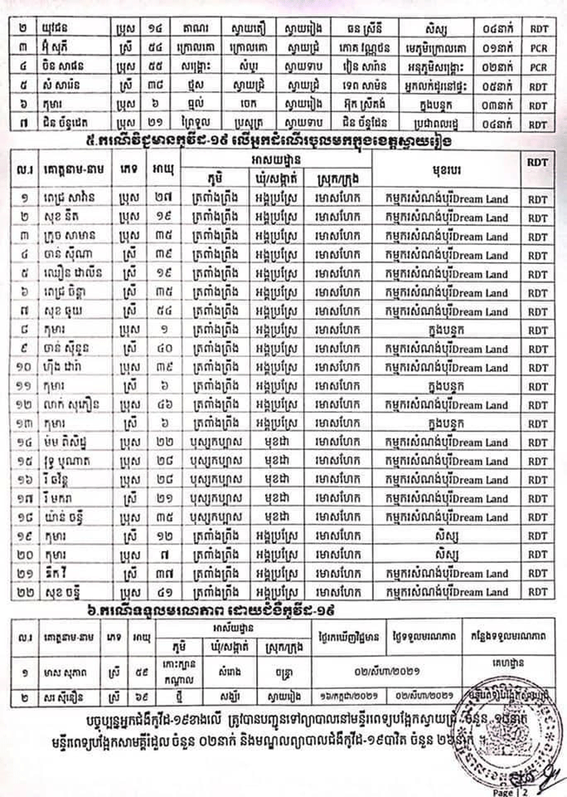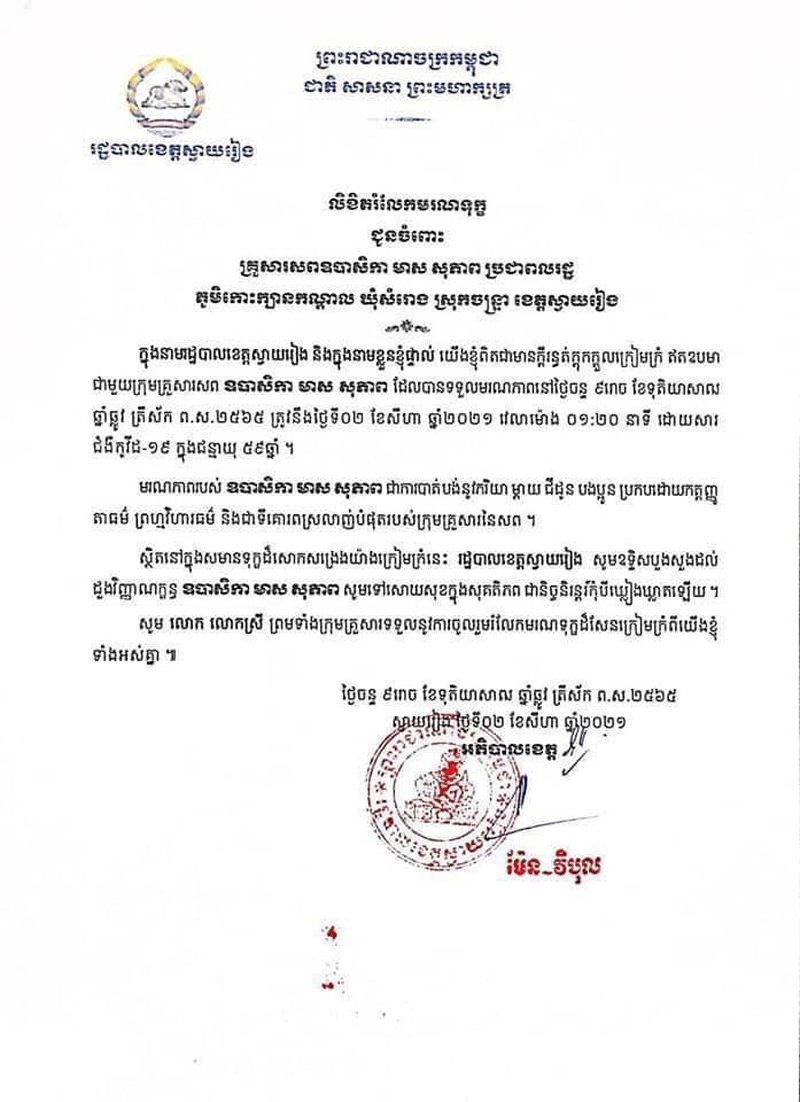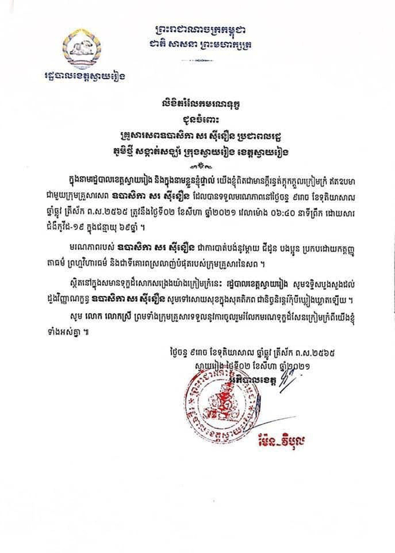 ស្រ្តីឈ្មោះសរ ស៊ីនឿន អាយុ៦៩ឆ្នាំ រស់នៅភូមិថ្មីសង្កាត់សង្ឃ័រក្រុងស្វាយរៀង យកសំណាកធ្វើតេស្តរហ័សរកឃើញវិជ្ជមានកូវីដ១៩ថ្ងៃទី១៩កក្កដា២០២១ ស្លាប់នៅថ្ងៃទី០២សីហា២០២១នៅមន្ទីរពេទ្យស្រុកស្វាយជ្រំ ។