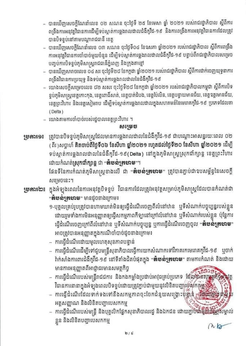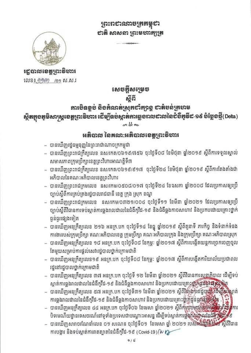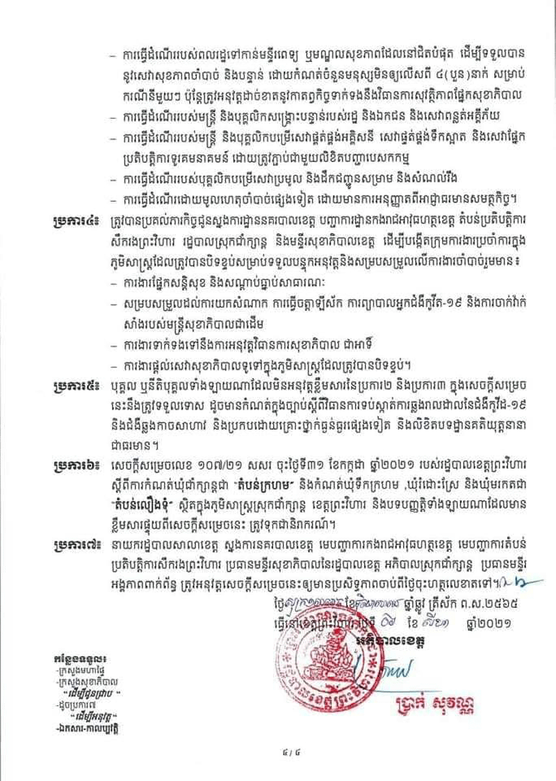 យោងសេចក្តីសម្រេចរបស់រដ្ឋបាលខេត្តព្រះវិហារ ដែលបានចេញនៅថ្ងៃទី៦ខែសីហាឆ្នាំ២០២១នេះ បានសម្រេច៖បិទខ្ទប់ភូមិសាស្ត្រដែលមានការឆ្លងរាលដាលជំងឺកូវីដ.១៩ជាបណ្តោះអាសន្នរយះពេល២សប្តាហ៍ គិតចាប់ពីថ្ងៃទី៦ខែសីហាឆ្នាំ២០២១ដល់ថ្ងៃទី២០ខែសីហាឆ្នាំ២០២១ ៕