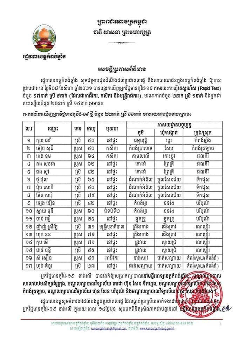 ខេត្តកំពង់ឆ្នាំង:បើយោងតាមរបាយកាណ៍របស់រដ្ឋបាលខេត្តកំំពង់ឆ្នាំងដែលទទួលបានថ្ងៃទី៩សីហា២០២១ស្តីពីសេចក្តីប្រកាស់ការបន្តរកឃើញអ្នកវិជ្ជមានកូវីដ19 តាមរយៈការធ្វើតេស្តរហ័ស(Rapid Test )ចំនួន១៧នាក់ស្រី៩នាក់ អាជីវក.កសិកនិងមន្ត្រីរាជការនិងអ្នកទទួលមរណះភាពប្រុសស្រីចំនួន២នាក់នៅថ្ងៃទី៨សីហា២០២១ម្សិលមិញ ។