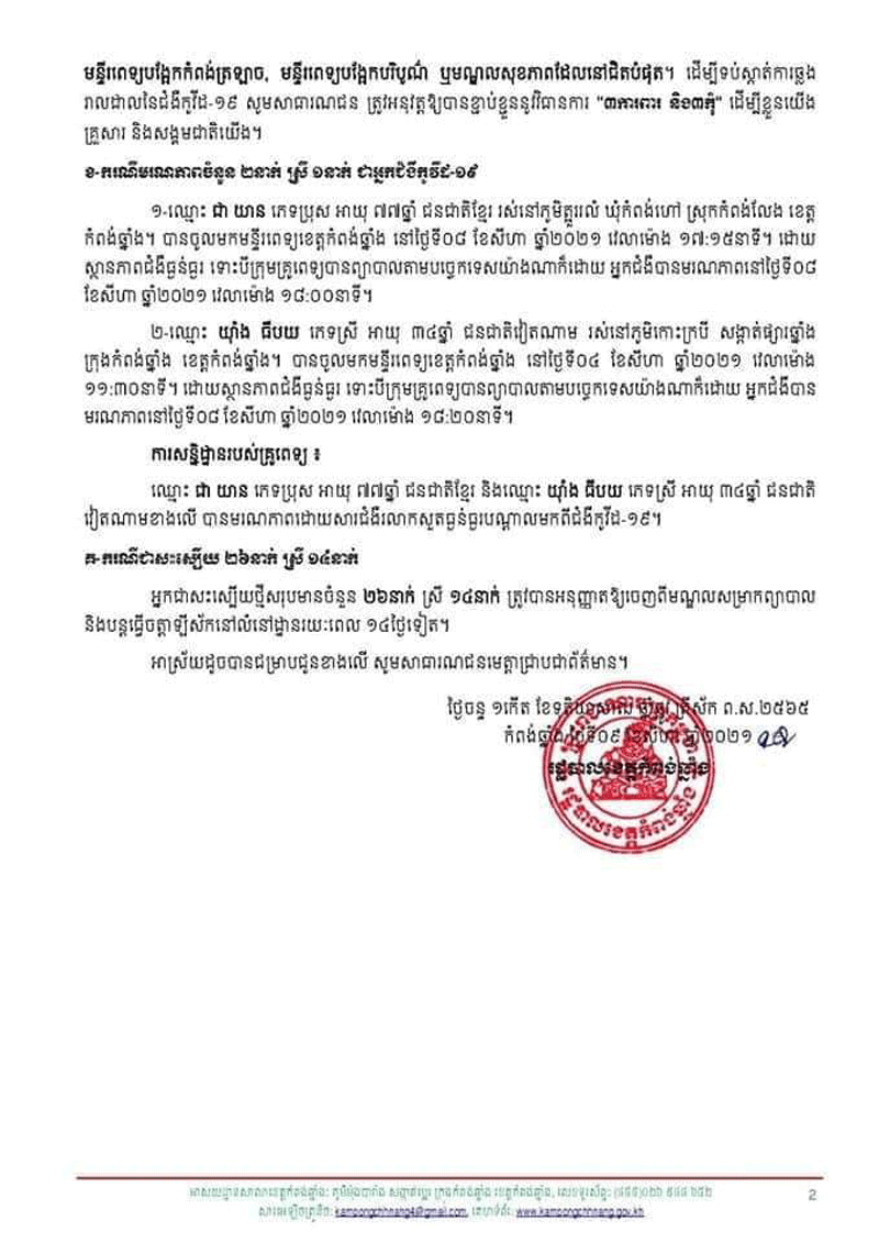 ក្នុងនោះករណីទទួលមរណះភាពជនជាតិខ្មែរនិងវៀតណាម២នាក់នៅថ្ងៃទី៨សីហា២០២១ម្សិលមិញមាន