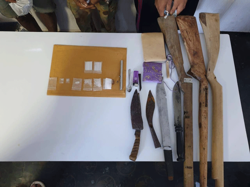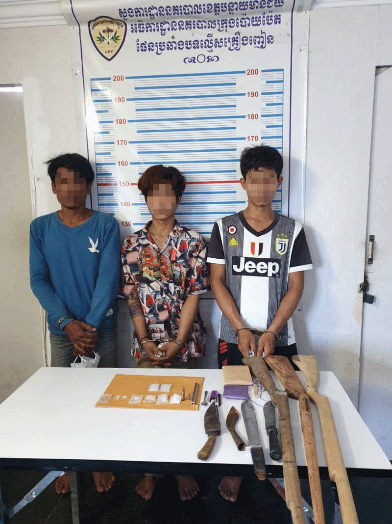 ជនសង្ស័យទាំង03នាក់នោះរួមមាន 1.ឈ្មោះ ភិន ចាន់រ៉ា ភេទប្រុស អាយុ 16ឆ្នាំ 2.ឈ្មោះ ហ៊ាង សុខហឿន ភេទប្រុស អាយុ36 ឆ្នាំ។ តាមចម្លើយសារភាពជនសង្ស័យទាំង02នាក់ខាងលើ សមត្ថកិច្ចបានបន្តឃាត់ខ្លួនជនសង្ស័យម្នាក់ឈ្មោះ ហេង ចំណង់ ហៅអេវ ភេទប្រុស អាយុ27ឆ្នាំ ជនសង្ស័យទាំងបីនាក់ មានទីលំនៅ សង្កាត់និមិត្ត ក្រុងប៉ោយប៉ែត ខេត្តបន្ទាយមានជ័យ។ ដកហូតវត្ថុតាងរូម៖ ម្ស៉ៅក្រាមពណ៌សថ្លា(សង្ស័យសារធាតុញៀន) ចំនួន 06កូនថង់តូច, បំពង់កែវ1, បំពង់ចូកគ្រឿងញៀនចំនួន1 កាំភ្លើងកែឆ្នៃប៊ិច1, គ្រាប់2គ្រាប់(គ្រាប់AK១គ្រាប់) កាំបិត04ដើម, ម្ស៉ៅម៉ត់សលាយជាមួយកំទេចថ្នាំពណ៌ផ្កាឈូក 01កូនថង់តូច, ដងកាំភ្លើងស្នប់កែច្នៃ៣ដើម, សំបកថង់មួយចំនួន និងទូរសព្ទ 01 គ្រឿង។