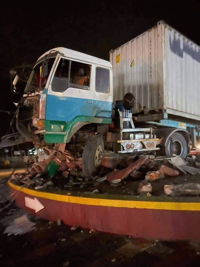 ខេត្តស្វាយរៀង៖(ព័ត៌មានបឋម)នៅវេលាម៉ោងប្រមាណជា 8 និង 20 នាទីយប់ថ្ងៃទី 16 ខែសីហាឆ្នាំ 2021 មានករណីគ្រោះថ្នាក់ចរាចរណ៍មួយដែលបង្កឡើងដោយរថយន្តកុងតឺន័រពាក់ស្លាកលេខភ្នំពេញ 3C0630 លេខកន្ទុយរឺម៉ក ភ្មំពេញ 4A1592 បើកបរមកពីទិសខាងលិចមកទិសខាងកើត នៅលើដងផ្លូវជាតិលេខ 1 លុះមកដល់ត្រង់ចំណុចខាងមុខមន្ទីរអប់រំយុវជននិងកីឡាខេត្តស្វាយរៀង ស្ថិតក្នុងក្រុងស្វាយរៀង ក៏បានជ្រុលចង្កូតទៅបុករូបសំណាក់នាគព័ន្ធ ដែលមានសរសេរពាក្យស្លោកថា ខេត្តស្វាយរៀងសូមស្វាគមន៍ បណ្ដាលឲ្យខ្ទេចខ្ទីទាំងស្រុងតែម្ដង។