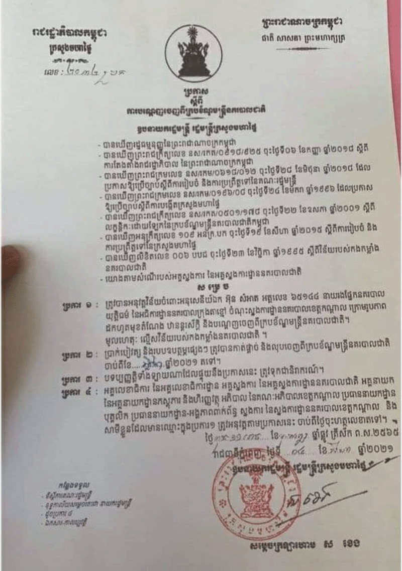 ប្រការ២…ប្រាក់បៀវត្ស និងរបបឧបត្ថម្ភផ្សេងៗត្រូវកាត់ផ្ដាច់ និងលុបចេញពីក្របខ័ណ្ឌមន្ត្រីនគរបាលជាតិចាប់ពីខែវិច្ឆិកា ឆ្នាំ២០២១ តទៅ។