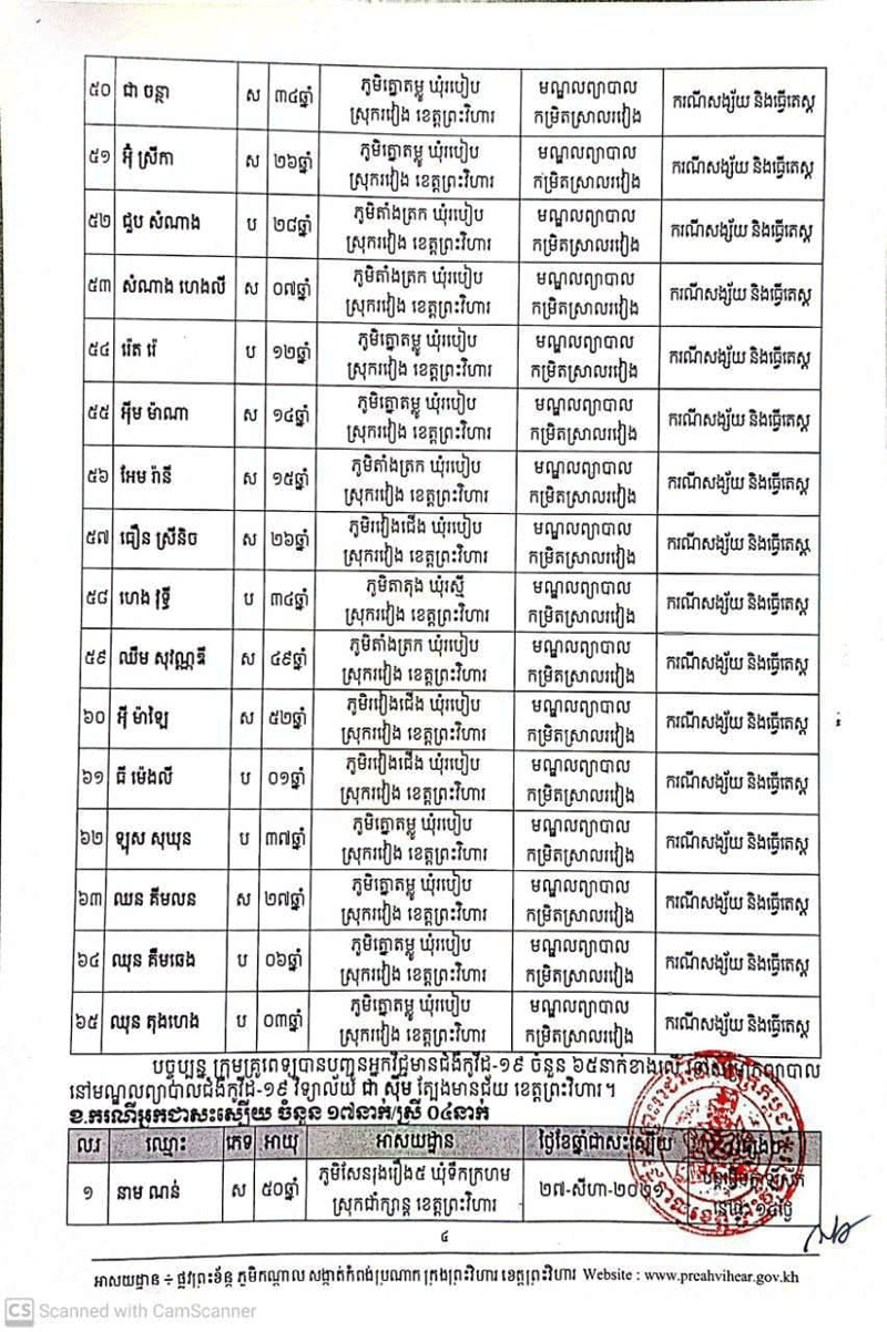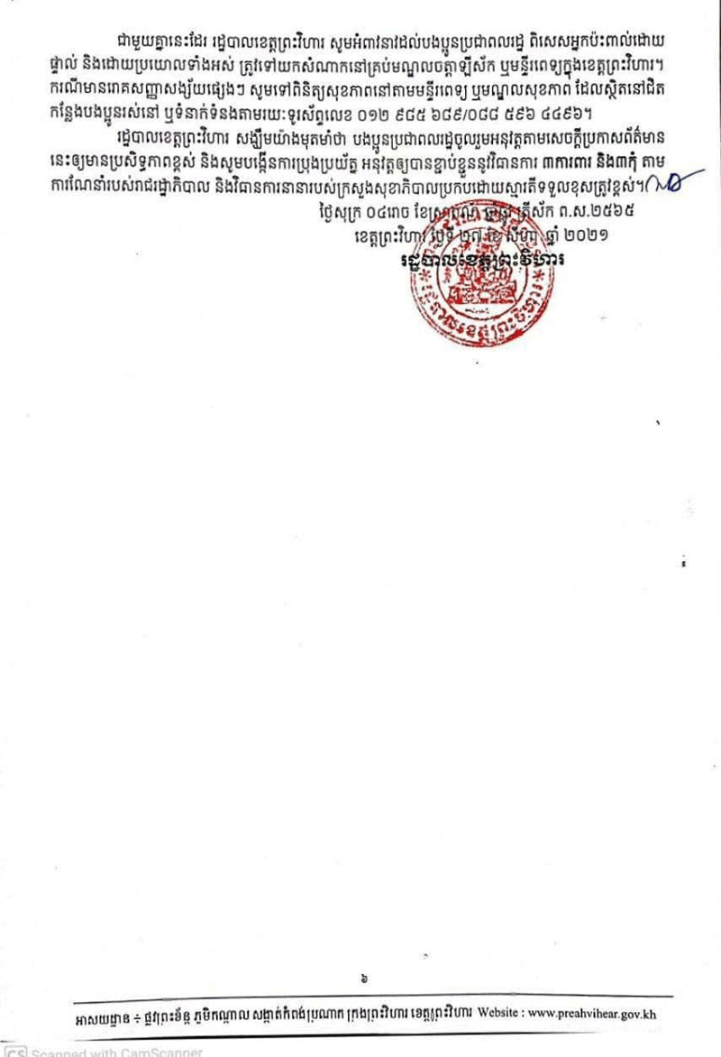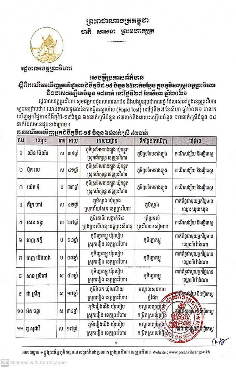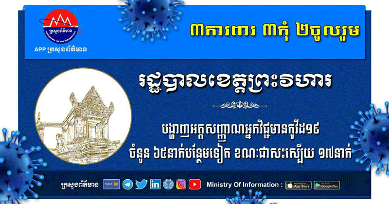 រដ្ឋបាលខេត្តព្រះវិហារប្រការករណីរកឃើញអ្នកវិជ្ជមានកូវីដ១៩ ចំនួន៦៥នាក់បន្ថែម ទៀតក្នុងភូមិសាស្ត្រខេត្តព្រះវិហារ admin — 27/08/2021 in ព័ត៌មានសំខាន់ 96 Likes 499 Views Share Tweet on Twitter Share on Facebook Google+ Pinterest