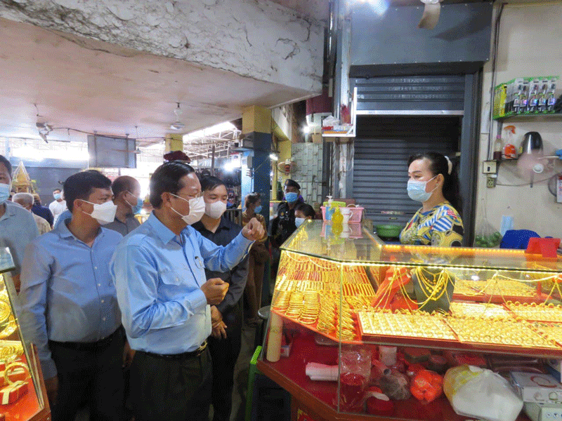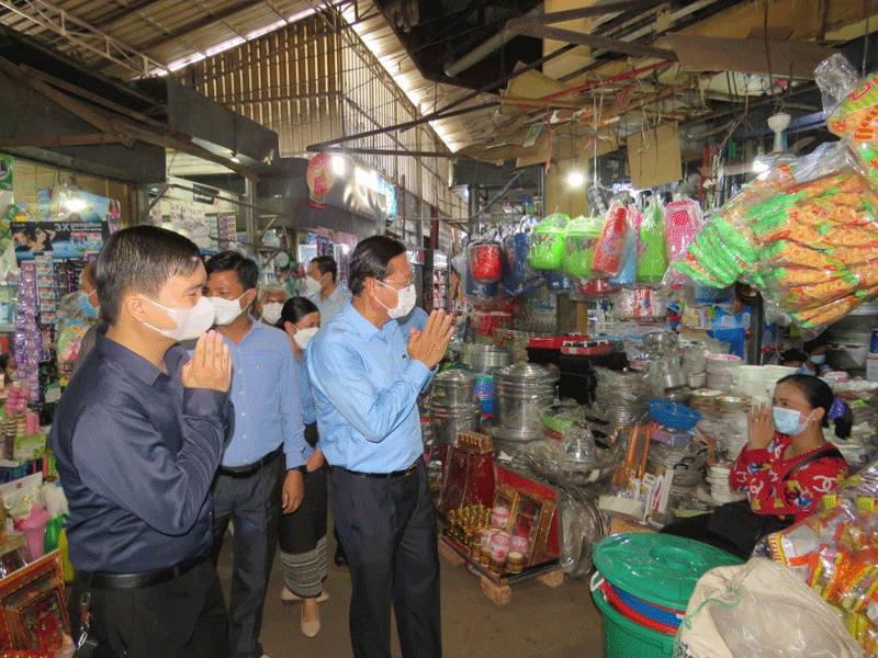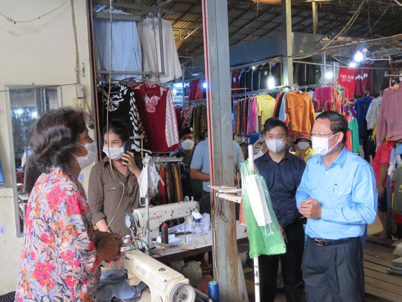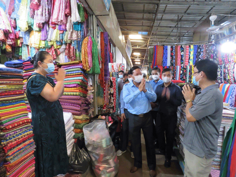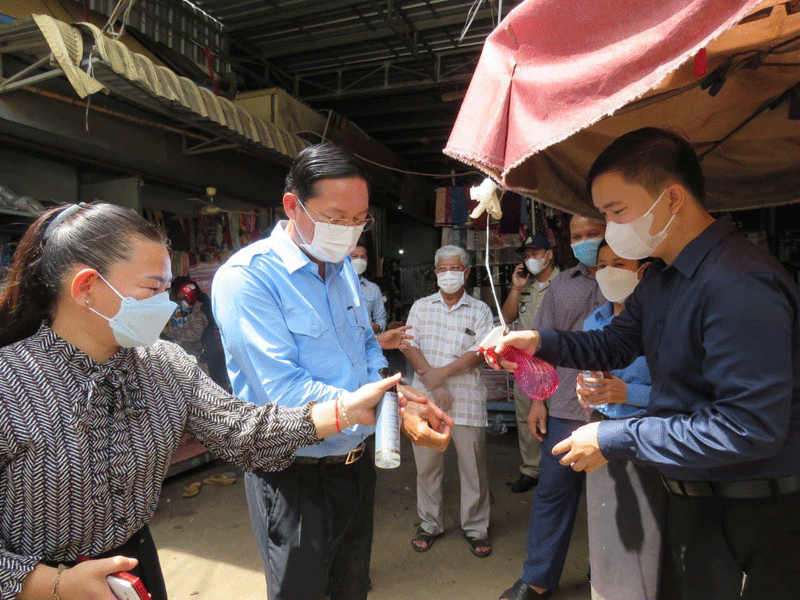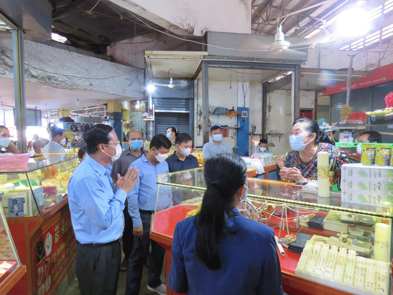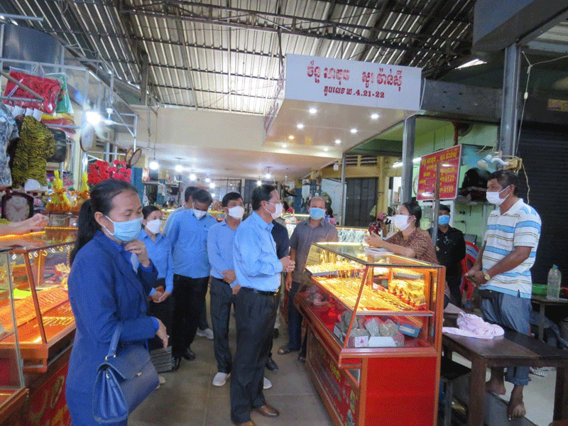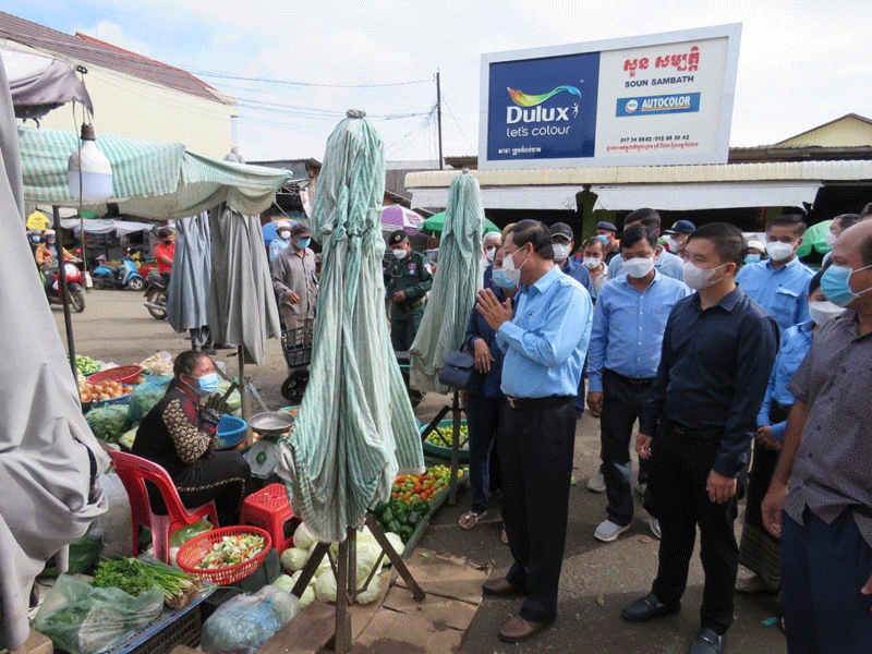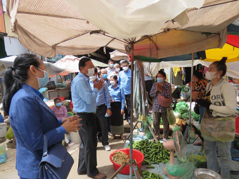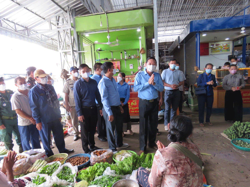 កំពង់ចាម : ឯកឧត្តម ខ្លូត ចិន្តា អភិបាលរងខេត្ត និងជាប្រធានអនុគណ:កម្មការដឹកនាំអនុវត្តច្បាប់ខេត្ត តំណាង ឯកឧត្តម អ៊ុន ចាន់ដា អភិបាលខេត្តកំពង់ចាម និងជាប្រធានគណ:កម្មការខេត្តប្រយុទ្ធ ប្រឆាំង នឹងជំងឺកូវីដ-១៩ នាព្រឹក ថ្ងៃទី ៣០ ខែសីហា ឆ្នាំ ២០២១ នេះ បានដឹកនាំក្រុមការងារចុះសួរសុខទុក្ខបងប្អូនគណ:អាជីវករ និងអាជីវករ ផ្សារ បឹងកុក ក្រុង កំពង់ចាម ដេីម្បី អនុវត្តពីការពាក់ម៉ាស និងវិធានរដ្ឋបាល ។