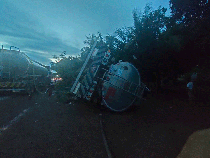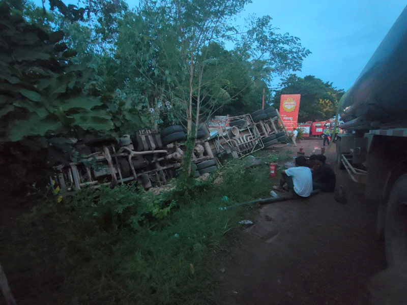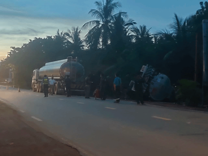 លុះមកដល់ចំណុចកើតហេតុខាងលើនេះស្រាប់តែមានម៉ូតូមួយគ្រឿងដែលបានបើកបញ្ច្រាសទិសគ្នាយ៉ាងលឿន បានគេចចេញពីគូថរថយន្តតូចមួយគ្រឿងនៅពីមុខចូលមកចំណែកផ្លូវខាងស្ដាំរបស់រថយន្តដឹកប្រេង ខណៈនោះអ្នកបើកបររថ យន្តដឹកប្រេង ក៏បានគេចមិនឲ្យបុកម៉ូតូនោះ បណ្ដាលឲ្យរថយន្តដឹកប្រេងរបស់ខ្លួនធ្លាក់ពីលើផ្លូវជាតិក្រ ឡាប់បះជើងនៅក្នុងប្រឡាយផ្នែកខាងស្ដាំដៃតែម្ដង សំណាងល្អមិនបណ្ដាលឲ្យផ្ទុះឆេះរថយន្តនិងប្រេងនោះឡើយ ។