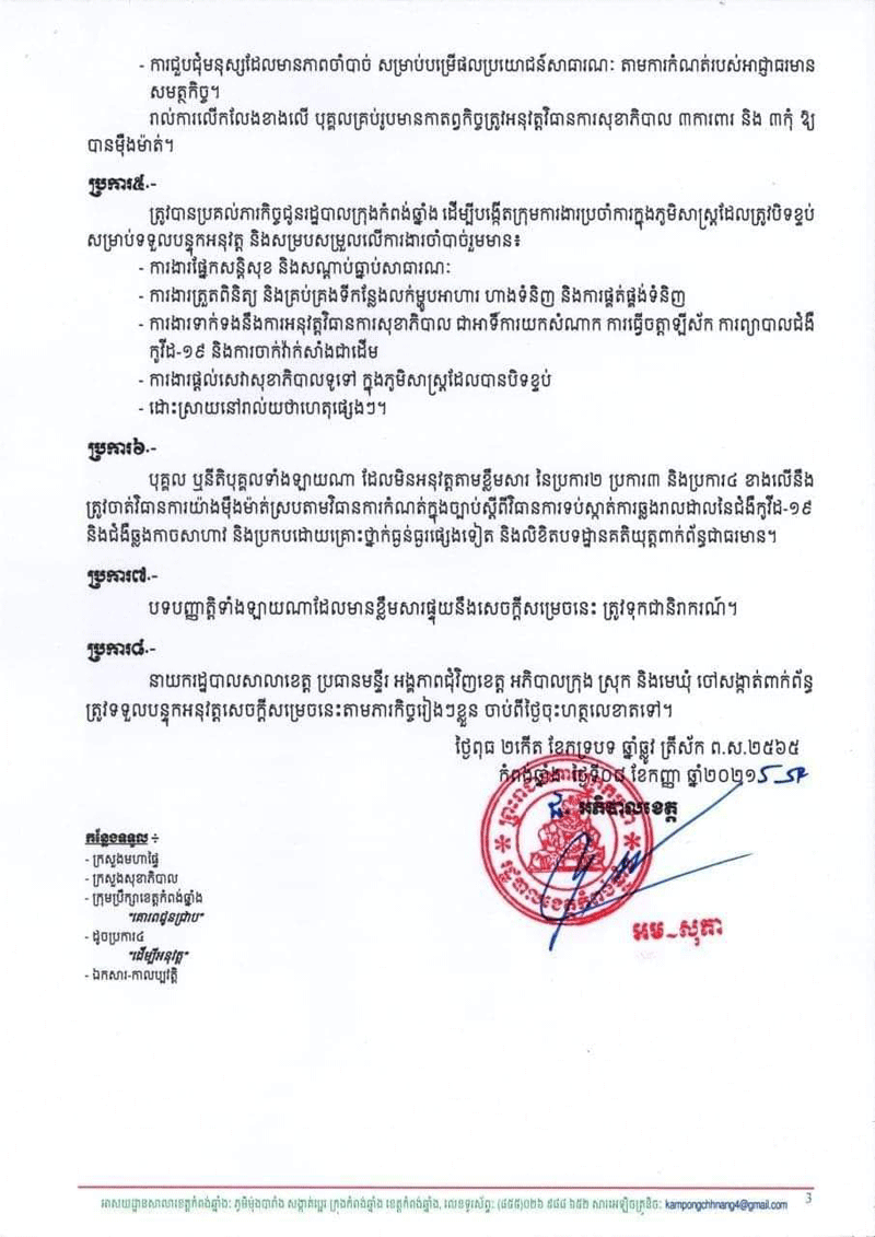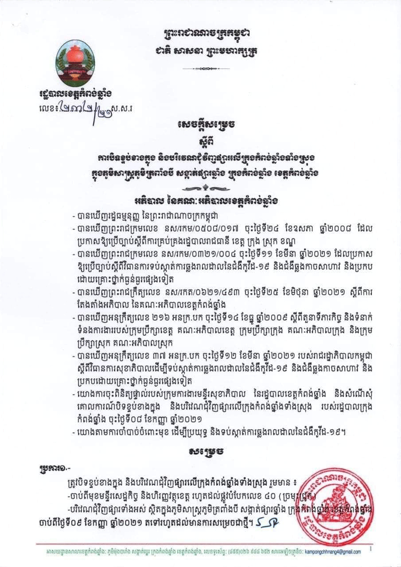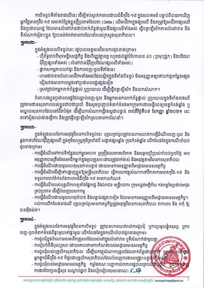 ខេត្តកំពង់ឆ្នាំង:រដ្ឋបាលខេត្តកំពង់ឆ្នាំងជូនដំណឹងស្តីពីការបិទខ្ទប់ខាងក្នុងនិងបរិវេណជុំវិញផ្សារលើក្រុងកំពង់ឆ្នាំងទាំងស្រុងជាលើកទ២បន្ទាប់ពីរកឃើញមានអ្នកឆ្លងកូវិដ១៩បំលែងថ្មីប្រភេទដែលតាDeltaលើមនុស្ស២នាក់ ។ប្រការ១ត្រូវបិទខ្ទប់ខាងក្នុងនៅបរិវេណជុំវិញផ្សារលើក្រុងកំពង់ឆ្នាំងទាំងស្រុងរួមមានចាប់ពីមុខមន្ទីរសេដ្ឋកិច្ចនិងហិរញ្ញវត្ថុខេត្តរហូតដល់ផ្លូវបំបែកលេខ 40 ច្រមុះជ្រូកបរិវេណជុំវិញផ្សារទាំងអស់ស្ថិតក្នុងភូមិសាស្ត្រភូមិត្រពាំងបីសង្កាត់ផ្សារឆ្នាំងក្រុងខេត្តកំពង់ឆ្នាំងចាប់ពីថ្ងៃទី 9 កញ្ញា 2021 ក៏ទៅរហូតមានការសម្រេចជាថ្មី ។