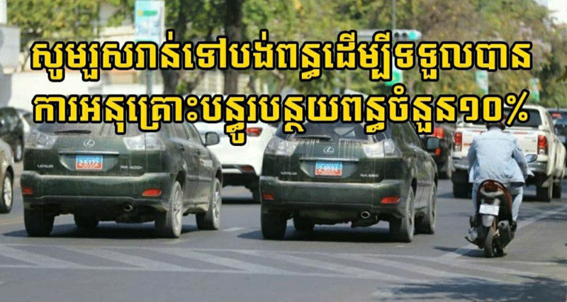២៖ ដើម្បីជាការលើកទឹកចិត្តឲ្យម្ចាស់ យានយន្តចូលខ្លួនមកបំពេញកាតព្វកិច្ចពន្ធ និងអាករឲ្យបានទាន់ពេលវេលាម្ចាស់យានយន្ត នឹងទទួលបានការអនុគ្រោះ បន្ធូរបន្ថយពន្ធចំនួន១០% នៃទឹកប្រាក់ពន្ធអាករសរុបដែលត្រូវបង់។