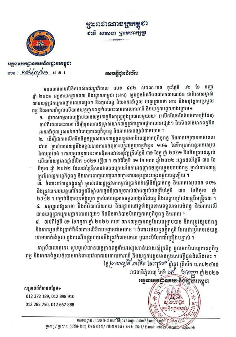 ភ្នំពេញៈ អគ្គនាយកដ្ឋានគយ និងរដ្ឋាករកម្ពុជា បានចេញសេចក្តីជូនដំណឹងថ្មីមួយ ជូនដល់ម្ចាស់យានយន្តជ្រកក្រោមផ្លាកលេខផ្សេងៗ និងគ្មានពន្ធ និងអាករនាំចូល ពីការអនុវត្តការប្រមូលពន្ធ និងអាករនាំចូល លើយានយន្តគ្មានពន្ធ។ នេះបើតាមសេចក្តីជូនដំណឹងដែល(អង្គភាព គេហទំព័រ សង្គមសន្តិភាព) ទទួលបាននៅថ្ងៃទី១០ ខែកញ្ញា ឆ្នាំ២០២១ម្សិលមិញ។