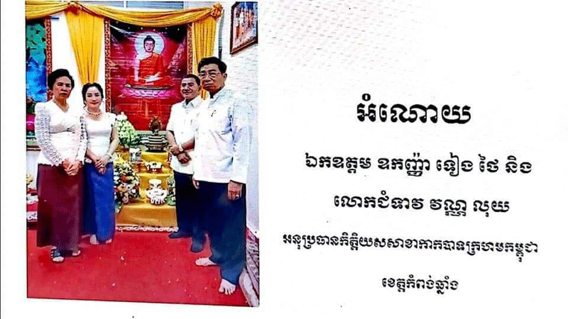 អនុប្រធានមន្ទីសង្គមកិច្ចនិងអតីតយុទ្ធជនខេត្តកំពង់ឆ្នាំង លោក ឈាង ចន្ធី និង និងលោកមេឃុំ. តាំង ប៊ុនទត . បានពាំនាំនូវប្រសាសន៍ផ្តាំផ្ញើសាកសួរសុខទុក្ខពីឯកឧត្តមឧកញ៉ា.ទៀង ថៃ .និង លោកជំទាវ .វណ្ណ្ណ លុយ .ដែលកន្លងមកឯកឧត្តមឧកញ៉ា និង លោកជំទាវ តែងតែគិតគូរពីសុខទុក្ខប្រជាពលរដ្ឋដែលជួបការលំបាកនៅខេត្តកំពង់ឆ្នាំងជាពិសេសជនចាស់ជរាដែលគ្មានទីពឹង ដោយមិនប្រកាន់ពូជសាសន៍និងនិន្នាការនយោបាយនោះឡើយ។