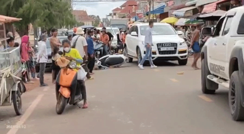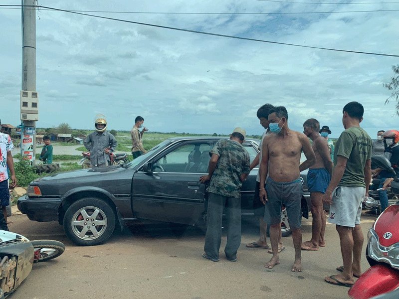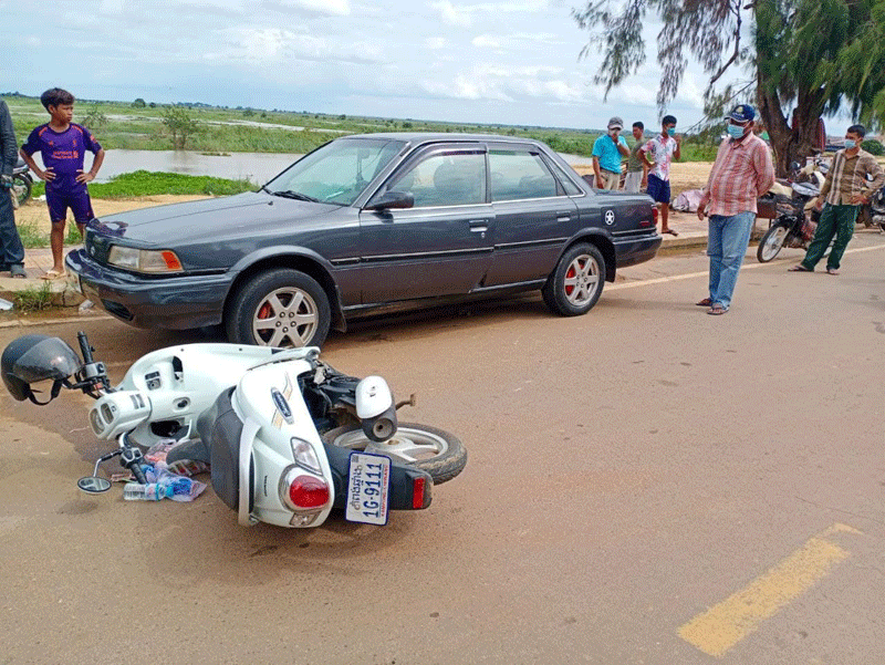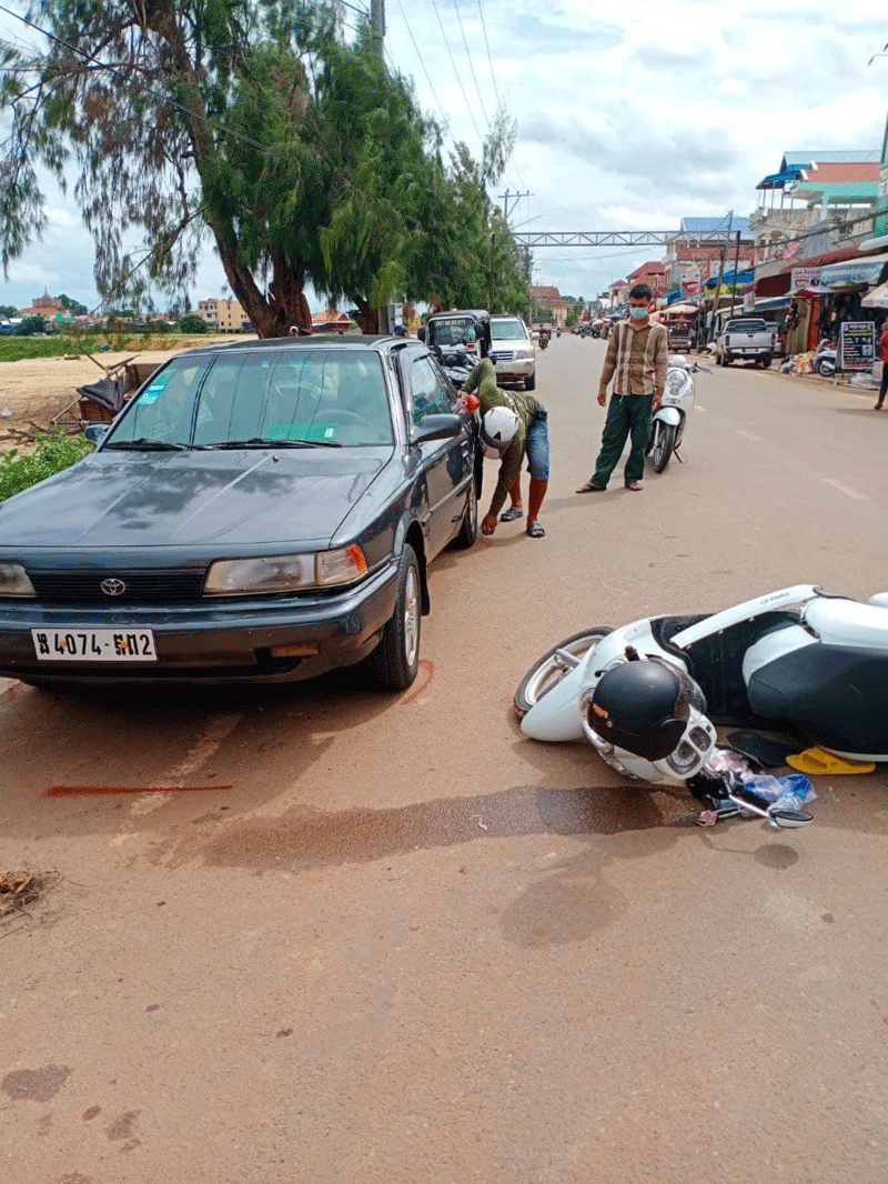 ដោយឡែករថយន្តកាមរីស្វិតពណ៍ប្រផេះពាក់ស្លាកលេខចាស់ ង.៤០.៧០ ភព២.បើកបរដោយជនមិនស្គាល់អត្តសញ្ញាណបើកបរពីលិចទៅកើតស្របទិសជានិងម៉ូតូស្កុបពីរួចបានឈប់និយាយទូរសព្ទ័នៅចំណុចខាងមុខផ្លូវចុះទំនប់បារាំងក្រោយនិយាយទូរសព្ទ័រួចបានបើកទ្វារថយន្តខាងមុខឆ្វេងដៃចេញក្រៅត្រូវអ្នកជិះម៉ូតូមកដល់បានបុកនិងទ្វារថយន្តហើយក៍ដួលខ្ទាតមកខាងឆ្វេងដៃទ្រូងផ្លូវគ្រាដែលរថយន្តម៉ាកអូឌីពណ៍ដពាក់ស្លាកលេខភ្នំពេញ2BE.99.53.បើកបរដោយជនមិនស្គាល់អត្តសញ្ញាណស្របទិសគ្នាបានមកដល់ឡើងវ៉ាម៉ូតូហើយបានកិនអ្នកជិះម៉តូពីក្រោយបណ្តាលអោយរងរបួសធ្ងន់លុះដល់មន្ទីពេទ្យជនរងគ្រោះបាន ស្លាប់តែម្តង ។