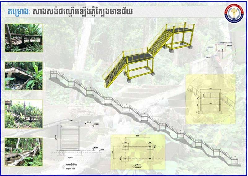 ព្រះវិហារៈ កាំជណ្តើរឡើងភ្នំត្បែងមានជ័យ នៅក្នុងខេត្តព្រះវិហារ ប្រមាណ២០០កាំ ដែលបានរងការបាក់ស្រុតខូចខាតដោយទឹកភ្លៀងកាលពីរដូវវស្សាកន្លងមក ពេលនេះត្រូវបានចាប់ផ្តើមដំណើរសាងសង់ជួសជុលឡើងវិញ ដោយបានរៀបចំពិធីសែនក្រុងពាលីសុំអ្នកតាម្ចាស់ទឹក ម្ចាស់ដី ព្រៃភ្នំ ដើម្បីសាងសង់ជាផ្លូវការ នៅព្រឹកថ្ងៃទី២៣ ខែមករា ឆ្នាំ២០២១នេះ និងត្រូវចំណាយថវិកា ប្រមាណ ១៤ម៉ឺនដុល្លារអាមេរិក។