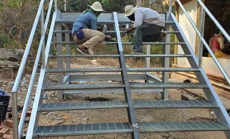 បើតាមលោក សំ លាងទ្រី ប្រធានមន្ទីរសាធារណការ និងដឹកជញ្ជូនខេត្តព្រះវិហារ ដែលជាអ្នកទទួលការសាងសង់កាំជណ្តើរឡើងភ្នំត្បែងមានជ័យនេះ បានថ្លែងប្រាប់គេហទំព័រ (សង្គមសន្តិភាព) ឱ្យដឹងនៅព្រឹកនេះថា៖ «កាំជណ្តើរឡើងភ្នំត្បែងមានជ័យ ដែលបាក់ស្រុតរងការខូចខាតដោយ ទឹកភ្លៀងកាលពីរដូវវស្សាកន្លងមក ពេលនេះបានចាប់ផ្តើមសាងសង់ឡើងវិញហើយ ដោយធ្វើអំពីដែកដូចដែលក្រុមជាងបានធ្វើជាគំរូស្រាប់ ដោយចំណាយថវិកាចំនួន ១៤មឺនដុល្លារ ហើយគ្រឿងមួយចំនួនទៀតគឺមានការកុម្មង់ទិញពីប្រទេសចិន លោកថាបើយើងកែច្នៃពីដែកសុទ្ធ គឺត្រូវចំណាយអស់ថវិកាច្រើន ហើយមានការលំបាកទៀតផងដែរ។