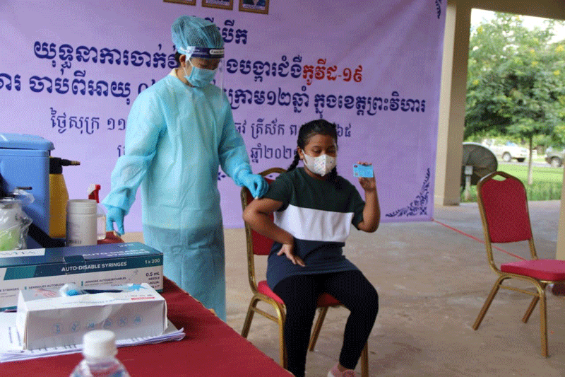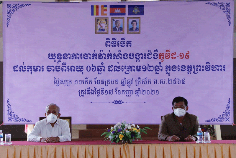 ព្រះវិហារ៖នារសៀល ថ្ងៃទី១៧ ខែកញ្ញា ឆ្នាំ២០២១ ឯកឧត្តម ឡុង សុវណ្ណ ប្រធានក្រុមប្រឹក្សាខេត្ត និងឯកឧត្តម ប្រាក់ សុវណ្ណ អភិបាលនៃគណៈអភិបាលខេត្តព្រះវិហារ និងជាប្រធានអនុកម្មការចំពោះកិច្ចចាក់វ៉ាក់សាំងកូវីដ ១៩ ក្របខណ្ឌទូទាំងខេត្តព្រះវិហារ ព្រមទាំង ថ្នាក់ដឹកនាំមន្ត្រីរាជការជុំវិញខេត្ត បានអញ្ជើញចូលរួមក្នុងពីធីបើកយុទ្ធនាការ ចាក់វ៉ាក់សាំង ជូនដល់កុមារ អាយុចាប់ពី០៦ឆ្នាំ ដល់អាយុក្រោម ១២ឆ្នាំ ក្នុងភូមិសាស្ត្រខេត្តព្រះវិហារ។