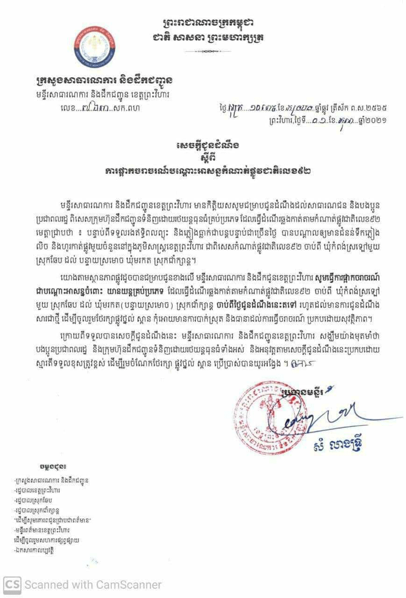 ព្រះវិហារ៖ មន្ទីរសាធារណការ និងដឹកជញ្ជូនខេត្តព្រះវិហារ មានកិត្តិយសសូមជម្រាបជូន ដំណឹងដល់សាធារណជន បងប្អូនប្រជាពលរដ្ឋ ជាពិសេសក្រុមហ៊ុនដឹកជញ្ជូនទំនិញ ដោយរថយន្តធុនធំគ្រប់ប្រភេទ មេត្តាជ្រាបអំពីការផ្អាកចរាចរណ៍បណ្ដោះ អាសន្នកំណាត់ ផ្លូវជាតិលេខ៩២ ចាប់ពីថ្ងៃផ្សាយដំណឹងនេះតទៅ។ (ព័ត៌មានលំអិតលម្អិតក្នុងសេចក្ដីជូនដំណឹង)SKS