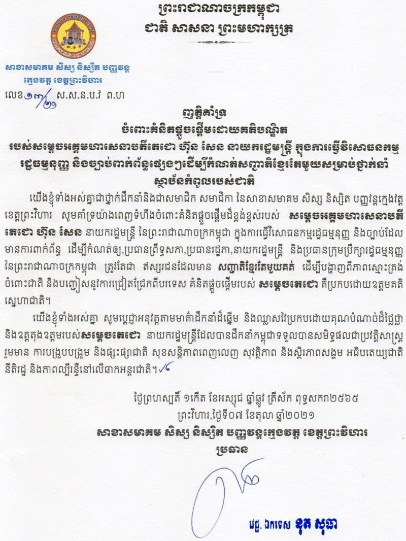 ព្រះវិហារ ៖សាខាសមាគម សិស្ស និស្សិតបញ្ញវន្តក្មេងវត្តប្រចាំខេត្តព្រះវិហារ រួមនិង ព្រះសង្ឃ ទូទាំងខេត្តព្រះវិហារទាំងមូល នៅថ្ងៃទី០៧ ខែតុលា ឆ្នាំ២០២១នេះ បានប្រកាសគាំទ្រចំពោះគំនិតផ្តួចផ្តើមដ៏ខ្ពង់ខ្ពស់ ប្រកបដោយឧត្តមគតិស្នេហាជាតិដ៏ជ្រាលជ្រៅរបស់ សម្តេចតេជោ ហ៊ុន សែន នាយករដ្ឋមន្ត្រីនៃកម្ពុជា ក្នុងការធ្វើវិសោធនកម្មរដ្ឋធម្មនុញ្ញ និងច្បាប់ដែលមានការពាក់ព័ន្ធ ដើម្បីកំណត់ឲ្យប្រធានព្រឹទ្ធសភា, ប្រធានរដ្ឋសភា, នាយករដ្ឋមន្ត្រី និងប្រធានក្រុមប្រឹក្សាធម្មនុញ្ញ នៃព្រះរាជាណាចក្រកម្ពុជា ត្រូវតែជាឥស្សរជនដែលមានសញ្ជាតិខ្មែរតែមួយគត់។