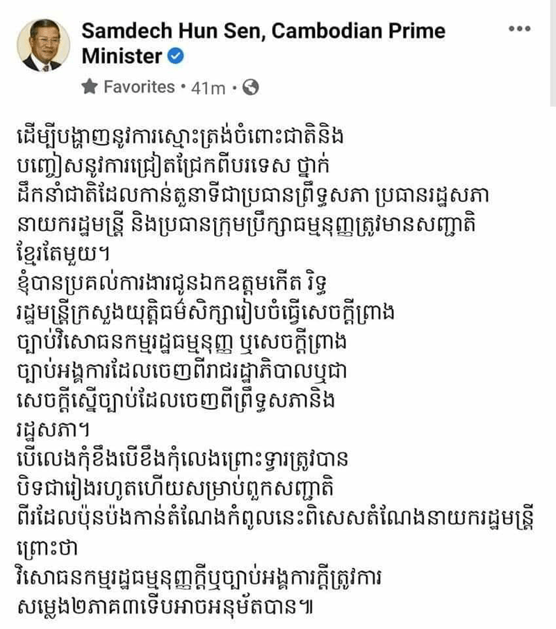 សូមបញ្ជាក់ថា សម្តេចតេជោ ហ៊ុន សែន នាយករដ្ឋមន្រ្តីនៃកម្ពុជា នៅថ្ងៃទី០៦ ខែតុលា ឆ្នាំ២០២១ម្សិលមិញនេះ បានបញ្ជាឱ្យរដ្ឋមន្រ្តីក្រសួងយុត្តិធម៌ លោក កើត រិទ្ធ សិក្សាអំពីការរៀបចំធ្វើវិសោធនកម្មរដ្ឋធម្មនុញ្ញ និងច្បាប់ពាក់ព័ន្ធ ដើម្បីកំណត់ឱ្យនាយករដ្ឋមន្រ្តី, ប្រធានរដ្ឋសភា, ប្រធានព្រឹទ្ធសភា និងប្រធានក្រុមប្រឹក្សាធម្មនុញ្ញ មានសញ្ជាតិខ្មែរតែមួយ។