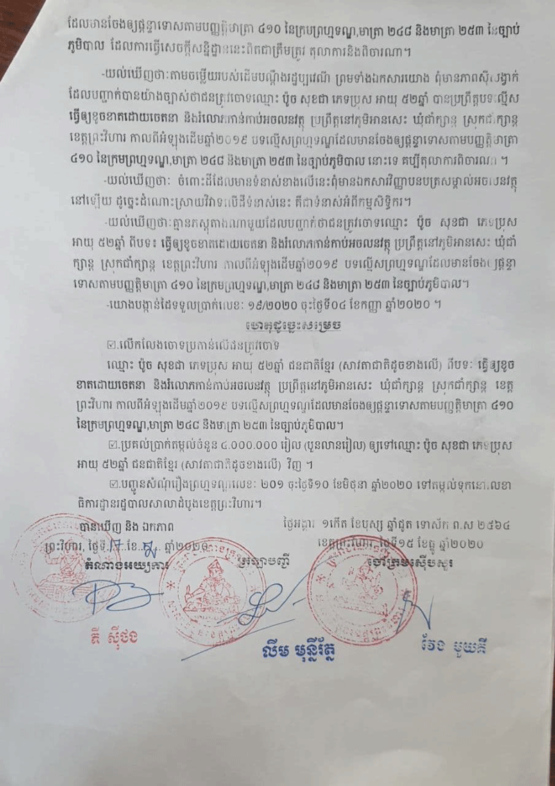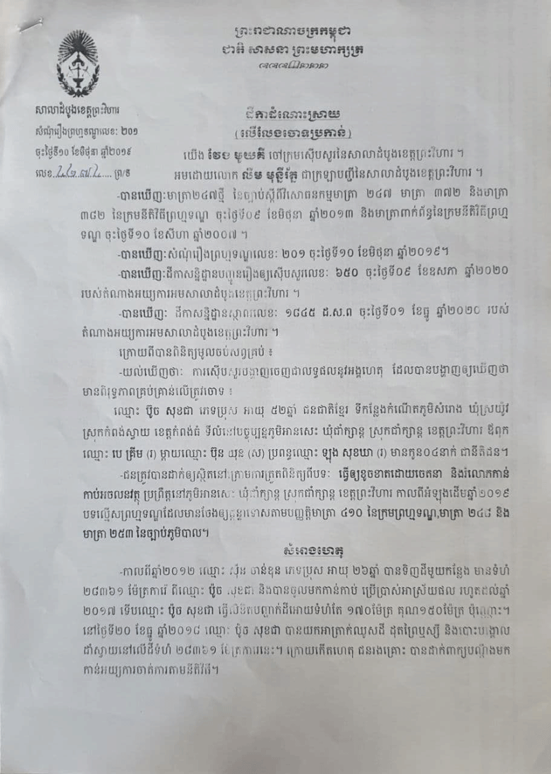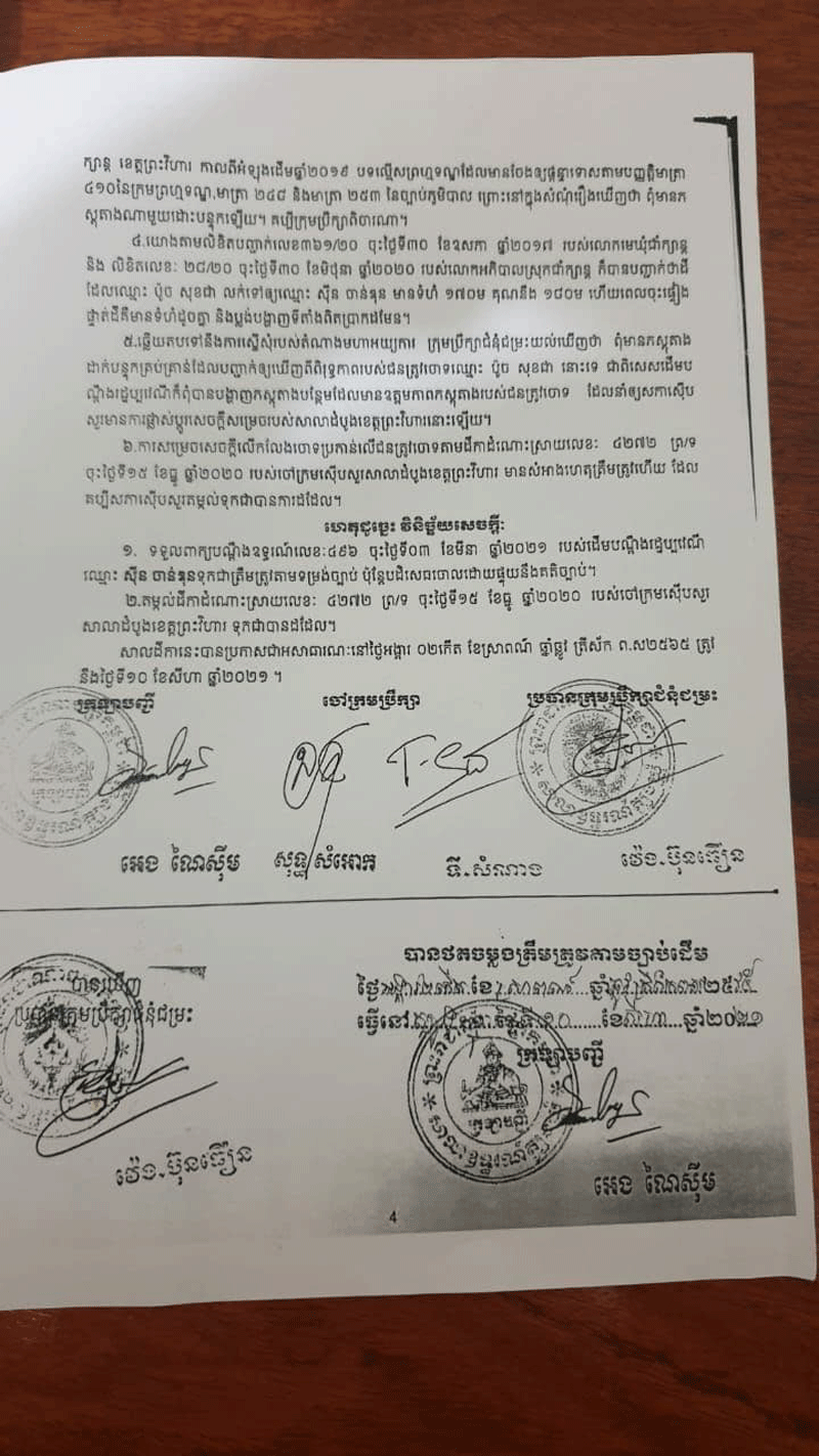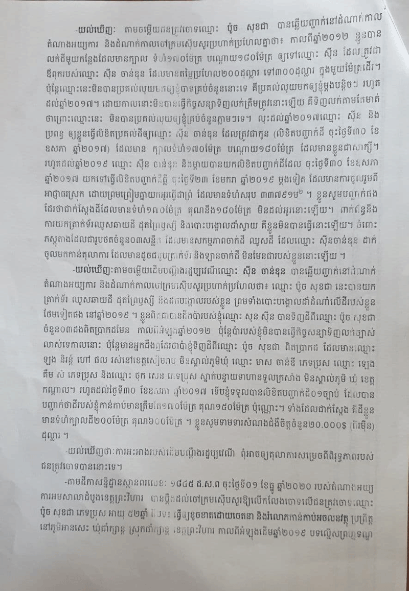 លោកឧត្តមសេនីយ៍ត្រី ប៉ូច សុខជា បានថ្លែងអោយដឹងនៅថ្ងៃទី១០ខែកញ្ញាឆ្នាំ២០២១ នេះថា៖រឿងក្តីមួយដែលមានរយះពេលប្រហែល៣ឆ្នាំទៅហើយ ដែលតុលាការខេត្ត ព្រះវិហារ និងសាលាឧទ្ទរណ៍ បានសម្រេចអោយលោកឈ្នះក្តីលើភាគីដើមចោទ ហេតុម្តេចក៍ ពេលថ្មីៗនេះមានទូរទស្សន៍អនឡាញក្នុងស្រុកមួយ ដកស្រង់ខ្លឹមសារតែនៅក្នុងពាក្យបណ្តឹង របស់ភាគីម្ខាងដែលបានប្តឹងលោកយកមកអាន ដែលជាហេតុធ្វើអោយមានការភាន់ច្រឡំ ពិសេសធ្វើអោយប៉ះពាលដល់កិត្តិយសរបស់លោកនិងក្រុមគ្រួសារ។ លោកប៉ូច សុខជា ថ្លែងបន្តថា៖សាលាដំបូងខេត្តព្រះវិហារលេខ២០១ចុះថ្ងៃទី១០ខែមិថុនាឆ្នាំ២០១៩ លើសំណុំរឿង៤២៧៤.ព្រ.ទ បានសម្រេចលើកលែងការចោទប្រកាន់លើរូបលោក ហើយបានប្រគល់ប្រាក់តម្កល់ចំនួន៤លានរៀលមកឲលោកវិញ។ដោយឡែកសាលាឧទ្ទរណ៍ត្បូងឃ្មុំសំណុំរឿងលេខ៤៨ចុះថ្ងៃទី១១ខែឧសភាឆ្នាំ២០២១ សាលដីកាលេខ៥៣ សស.ក្រII (វ.ធ)ចុះថ្ងៃទី១០ខែសីហាឆ្នាំ២០២១ បានសម្រេចទទួលពាក្យបណ្តឹងឧទ្ទរណ៍ លេខ៤៩៦ចុះ ថ្ងៃទី០៣ខែមិថុនាឆ្នាំ២០២១ របស់ដើមបណ្តឹងរដ្ឋប្បវេណីឈ្មោះ ស៊ីន ចាន់ឌុន ទុកជាត្រឹម ត្រូវតាមទម្រង់ច្បាប់ ប៉ុន្តែបដិសេធចោលដោយផ្ទុយនឹងគតិច្បាប់។ តម្កល់ដីកាដំណោះស្រាយលេខ៤២៧២ព្រ.ទ ចុះថ្ងៃទី១៥ខែធ្នូឆ្នាំ២០២០ របស់ចៅក្រមស៊ីបសួរសាលាដំបូងខេត្តព្រះវិហារ ទុកជាបានការដដែល។