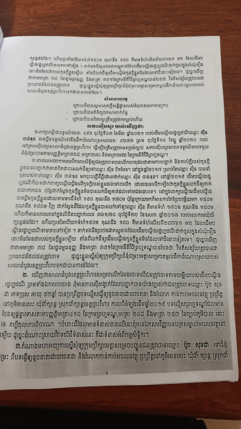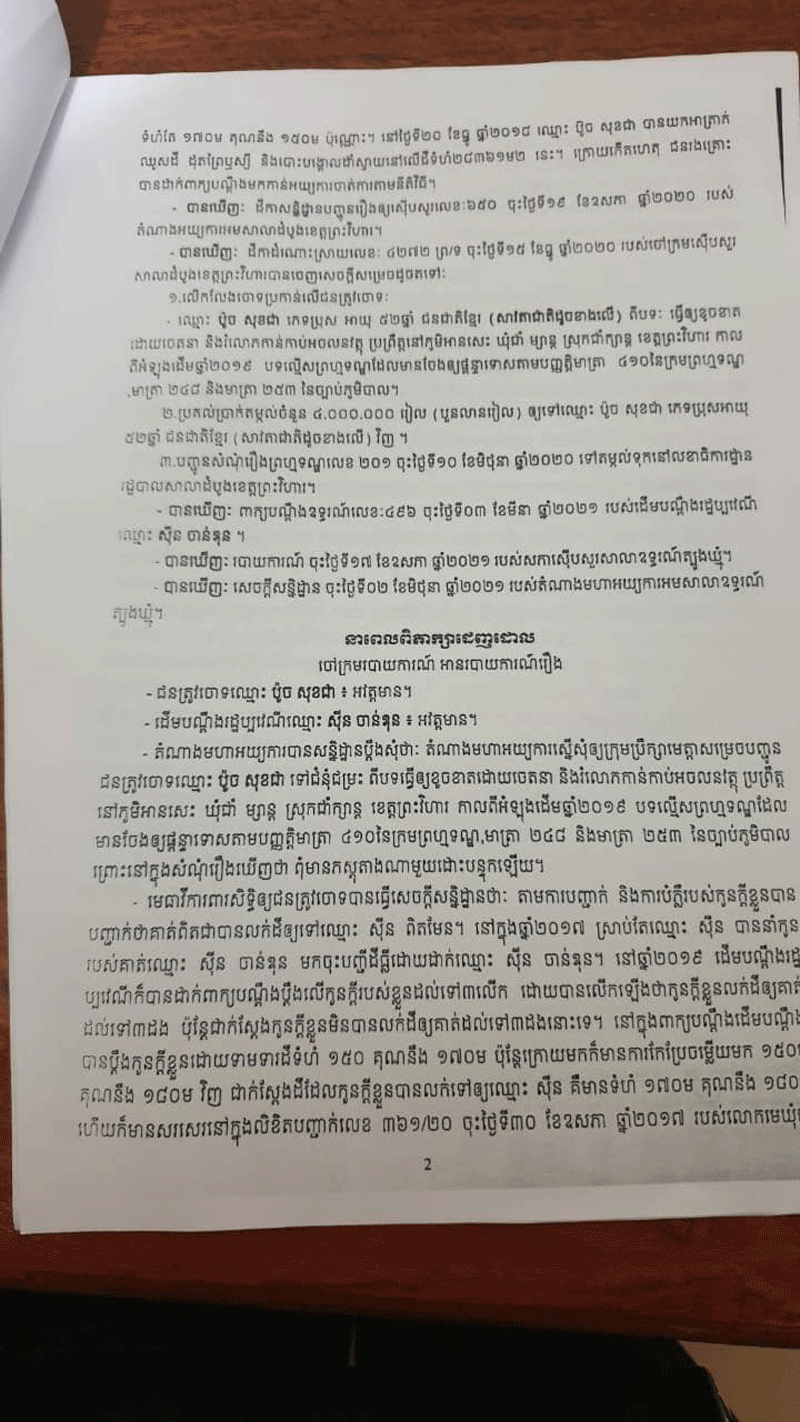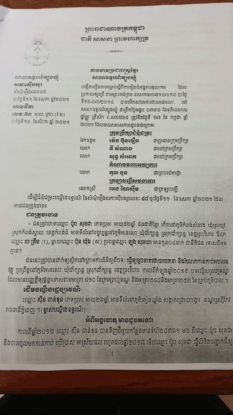 លោកឧត្តមសេនីយ៍ត្រី ប៉ូច សុខជា បានថ្លែងអោយដឹងនៅថ្ងៃទី១០ខែកញ្ញាឆ្នាំ២០២១ នេះថា៖រឿងក្តីមួយដែលមានរយះពេលប្រហែល៣ឆ្នាំទៅហើយ ដែលតុលាការខេត្ត ព្រះវិហារ និងសាលាឧទ្ទរណ៍ បានសម្រេចអោយលោកឈ្នះក្តីលើភាគីដើមចោទ ហេតុម្តេចក៍ ពេលថ្មីៗនេះមានទូរទស្សន៍អនឡាញក្នុងស្រុកមួយ ដកស្រង់ខ្លឹមសារតែនៅក្នុងពាក្យបណ្តឹង របស់ភាគីម្ខាងដែលបានប្តឹងលោកយកមកអាន ដែលជាហេតុធ្វើអោយមានការភាន់ច្រឡំ ពិសេសធ្វើអោយប៉ះពាលដល់កិត្តិយសរបស់លោកនិងក្រុមគ្រួសារ។ លោកប៉ូច សុខជា ថ្លែងបន្តថា៖សាលាដំបូងខេត្តព្រះវិហារលេខ២០១ចុះថ្ងៃទី១០ខែមិថុនាឆ្នាំ២០១៩ លើសំណុំរឿង៤២៧៤.ព្រ.ទ បានសម្រេចលើកលែងការចោទប្រកាន់លើរូបលោក ហើយបានប្រគល់ប្រាក់តម្កល់ចំនួន៤លានរៀលមកឲលោកវិញ។ដោយឡែកសាលាឧទ្ទរណ៍ត្បូងឃ្មុំសំណុំរឿងលេខ៤៨ចុះថ្ងៃទី១១ខែឧសភាឆ្នាំ២០២១ សាលដីកាលេខ៥៣ សស.ក្រII (វ.ធ)ចុះថ្ងៃទី១០ខែសីហាឆ្នាំ២០២១ បានសម្រេចទទួលពាក្យបណ្តឹងឧទ្ទរណ៍ លេខ៤៩៦ចុះ ថ្ងៃទី០៣ខែមិថុនាឆ្នាំ២០២១ របស់ដើមបណ្តឹងរដ្ឋប្បវេណីឈ្មោះ ស៊ីន ចាន់ឌុន ទុកជាត្រឹម ត្រូវតាមទម្រង់ច្បាប់ ប៉ុន្តែបដិសេធចោលដោយផ្ទុយនឹងគតិច្បាប់។ តម្កល់ដីកាដំណោះស្រាយលេខ៤២៧២ព្រ.ទ ចុះថ្ងៃទី១៥ខែធ្នូឆ្នាំ២០២០ របស់ចៅក្រមស៊ីបសួរសាលាដំបូងខេត្តព្រះវិហារ ទុកជាបានការដដែល។