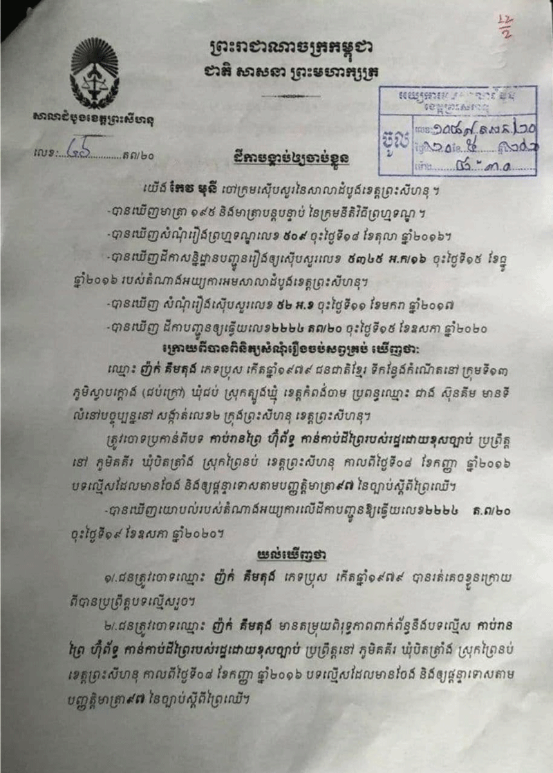 *ទី៨៖ ឈ្មោះ ឌួង ស៊ីបុណ្ណថុល ត្រូវបានចោទប្រកាន់ថាបានប្រព្រឹត្តិបទល្មើស គំរាមកំហែង សម្លាប់ ធ្វើឲ្យបាត់ជំនឿលើសេចក្តីសម្រេចរបស់តុលាការ ក្លែងឯកសារ ប្រើហិង្សាលើអ្នកកាន់កាប់អចលនវត្ថុដោយសុចរិត ញុះញ៉ង់ជាអាទិ៍ និងបង្កចលាចលដីធ្លីធ្វើឲ្យវឹកវរដល់អាជ្ញារធខេត្ត។